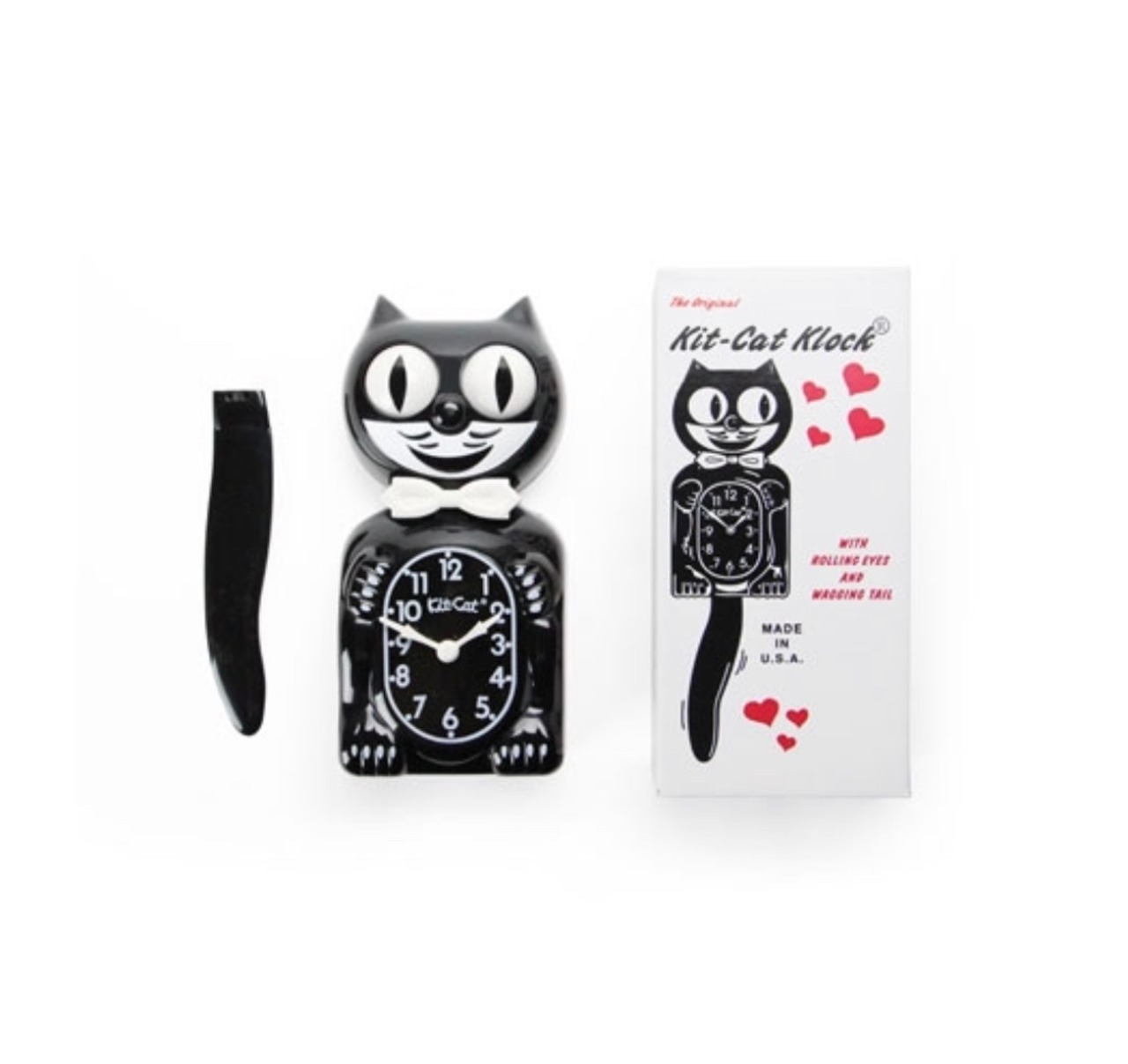 1930年代からほとんど変わらないデザインで生産され続けているキットキャットクロック。秒針に合わせて尻尾と目が左右に動きます。