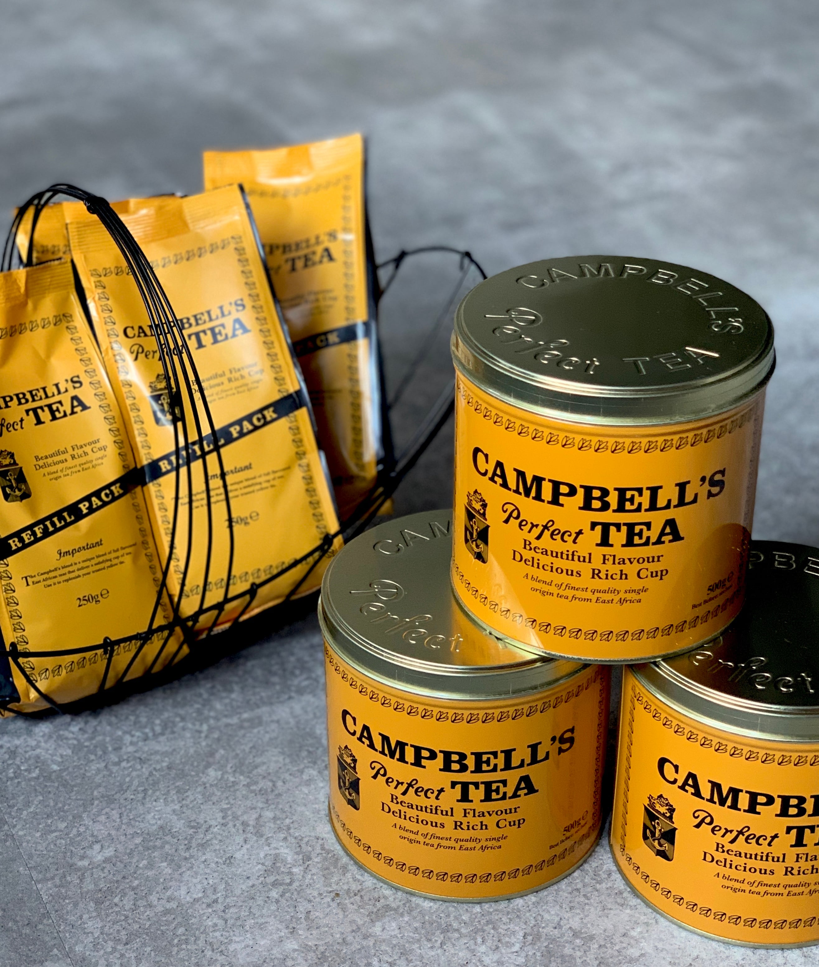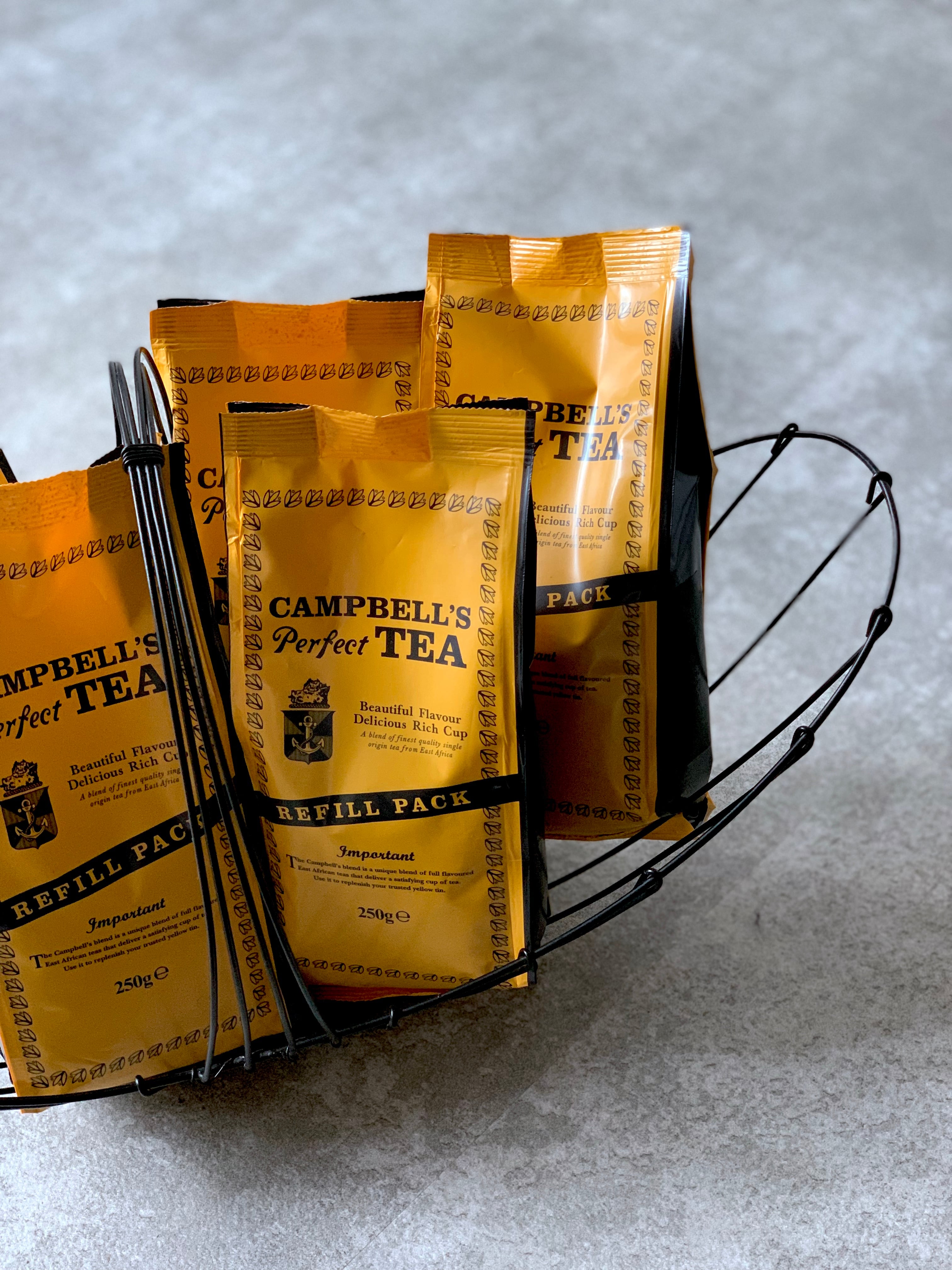 キャンベルズティーの缶と同じ、イエローに黒のロゴ入りの袋に250gの茶葉が入ったリフィルパックです。