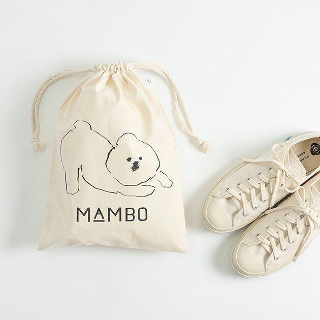 イラストレーター 塩川いづみさんの描いた、ビション・フリーゼという犬がモチーフ。人気の MAMBO が "PLAYBOW" ポーズをしている巾着。