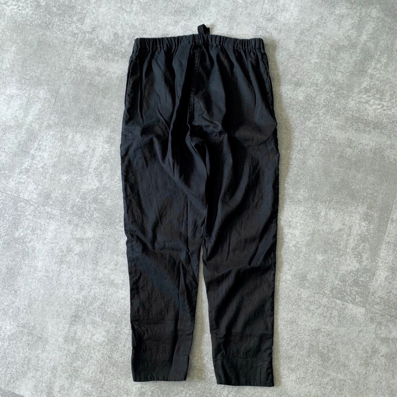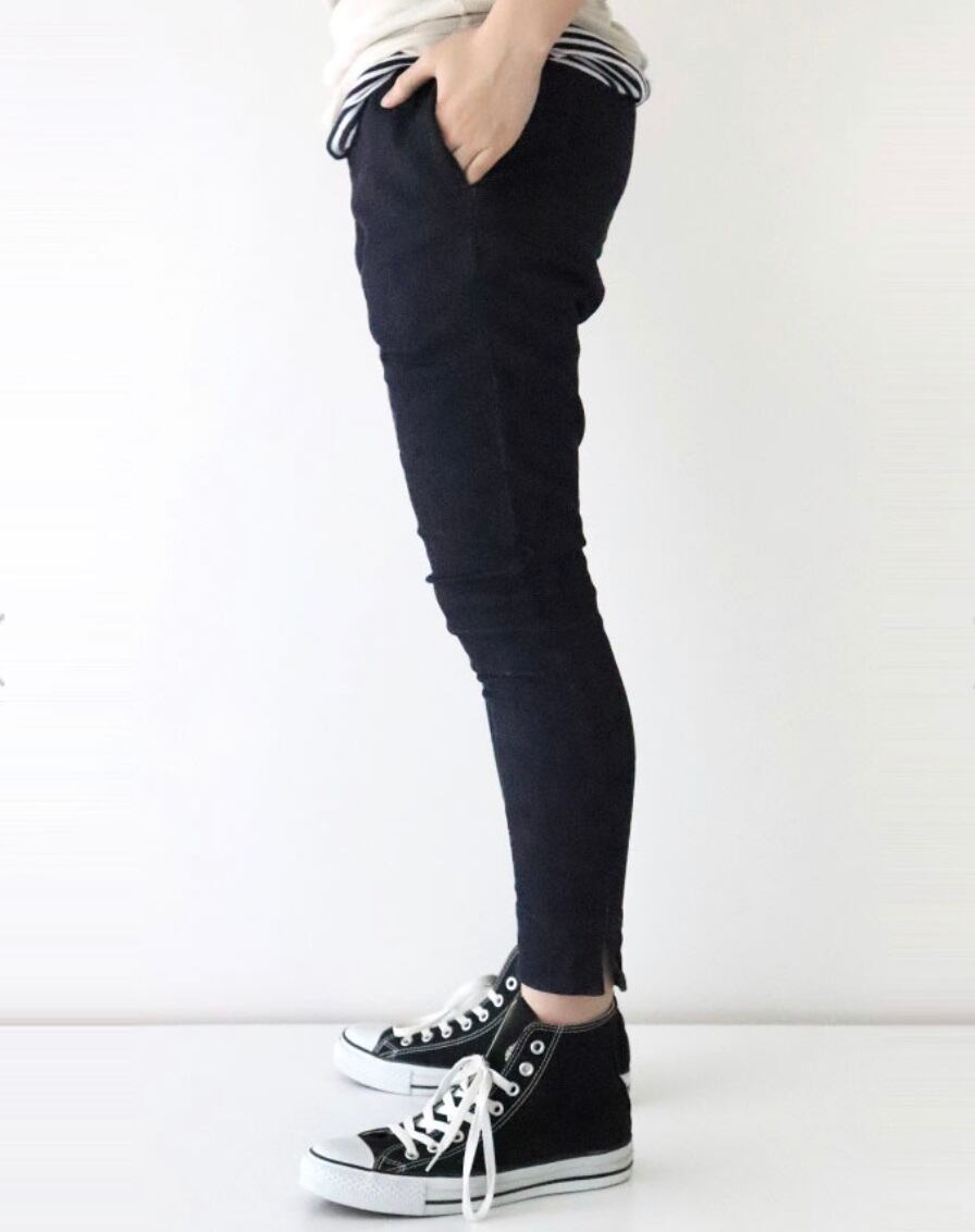 裾に向かって細くなる綺麗なシルエットが魅力的で、ポケットや裾のスリットなど、機能性とデザイン性を兼ね備えたパンツです。