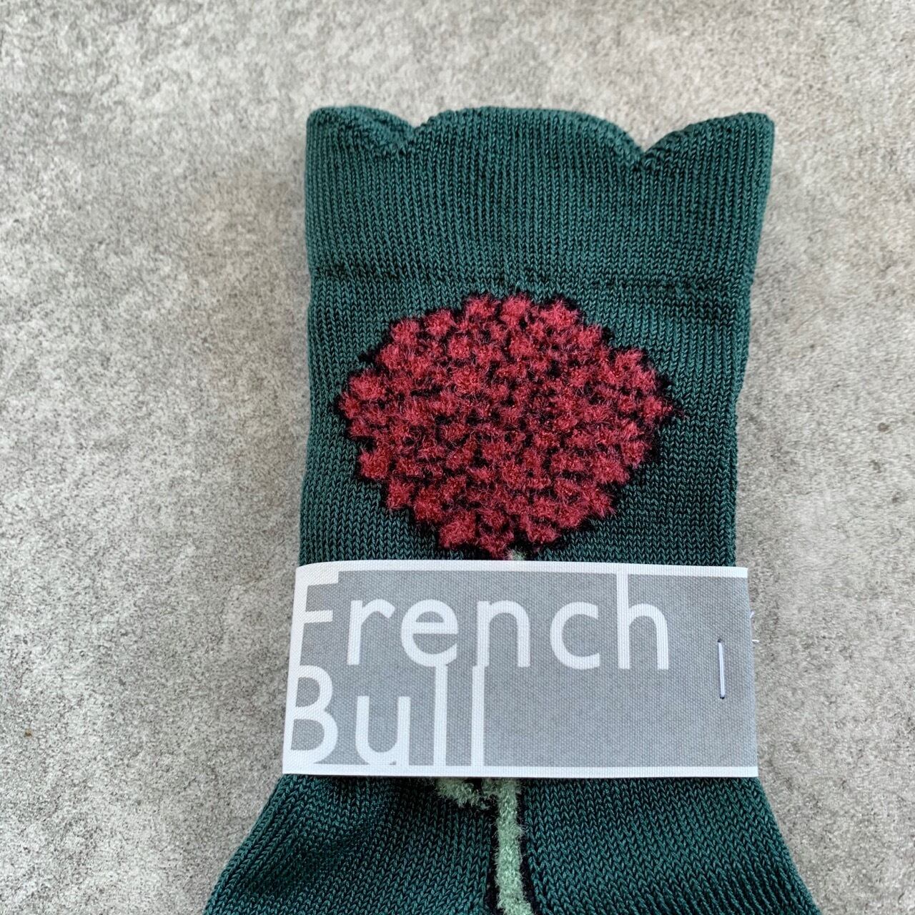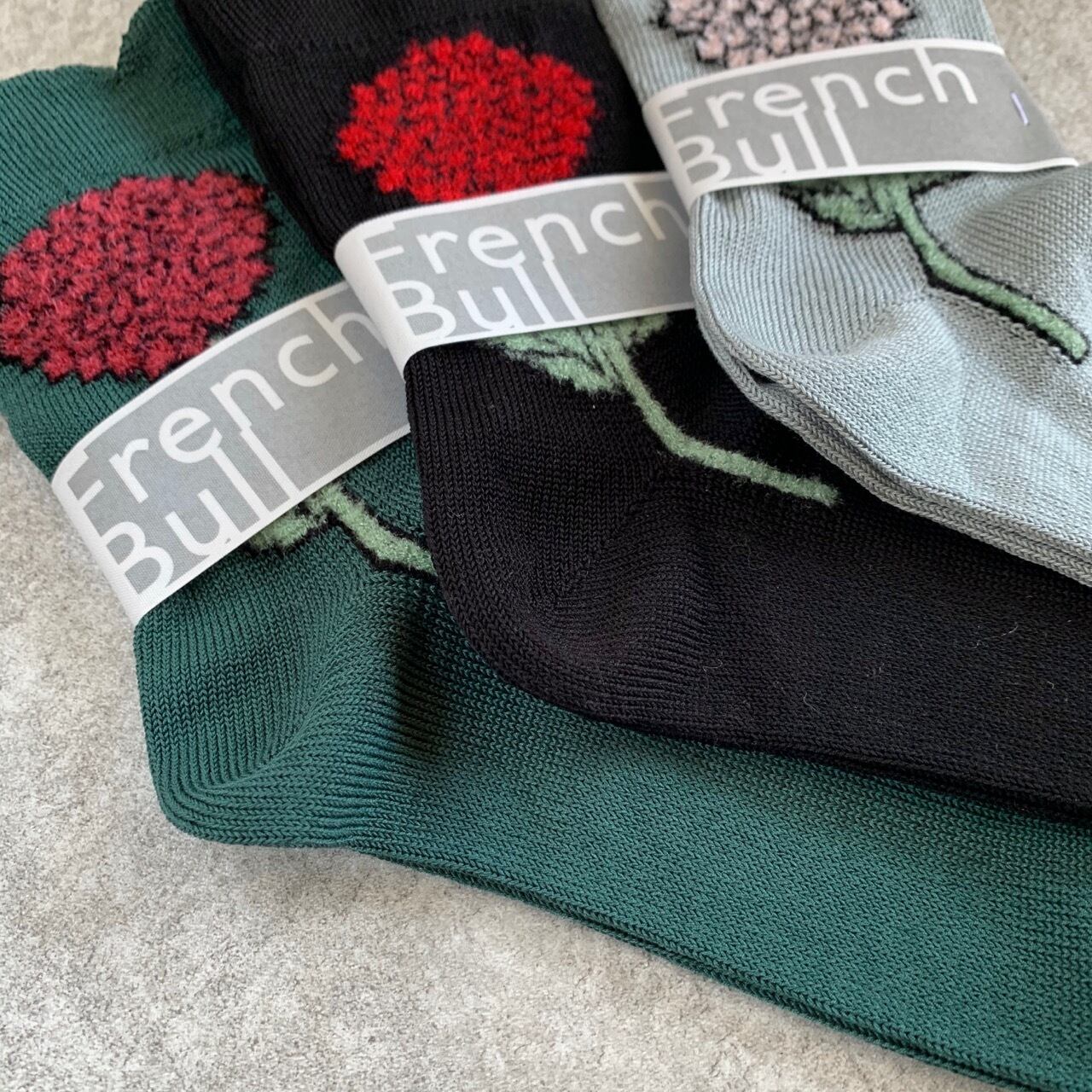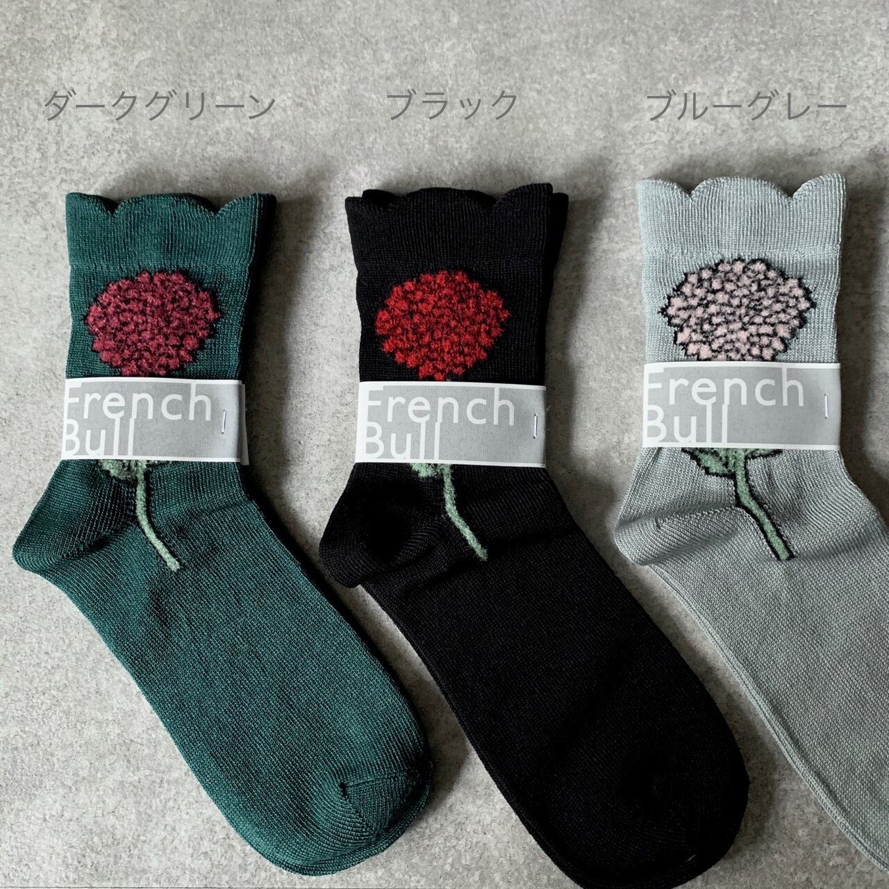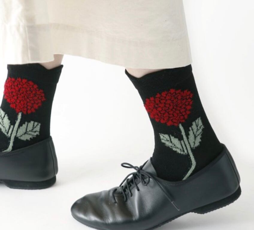 ダリアをモチーフにしたソックスです。柄部分はモール糸で編み立て、立体感を出しました。ベースはさらりとした艶のある綿糸で編み立て、シックさをプラスしました。大きな柄が着こなしのポイントになる1足です。
