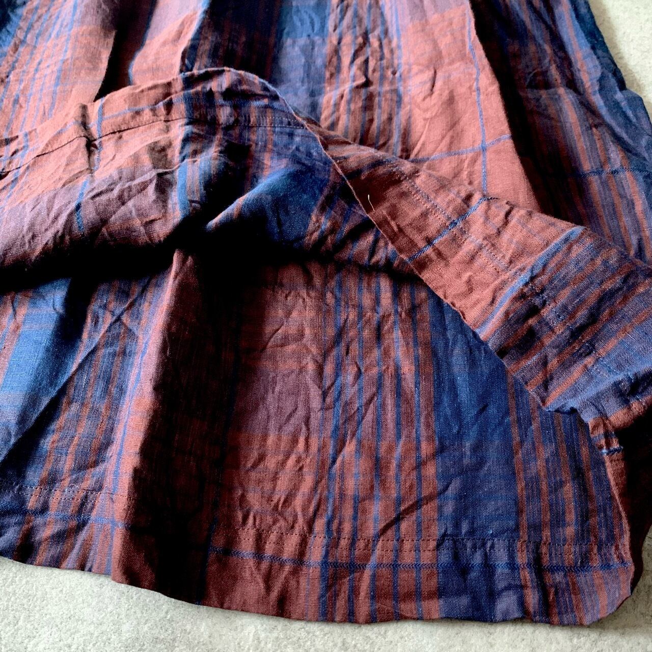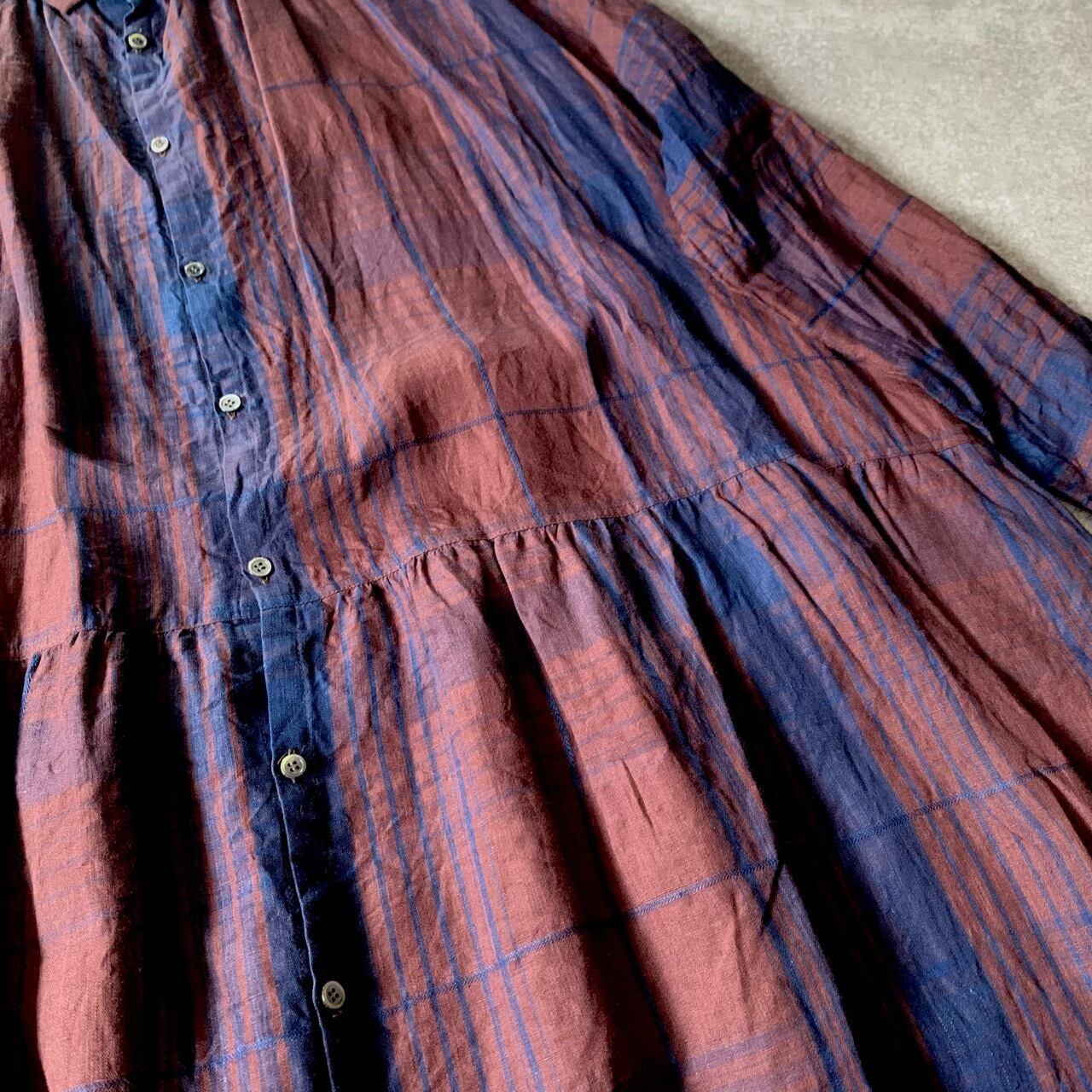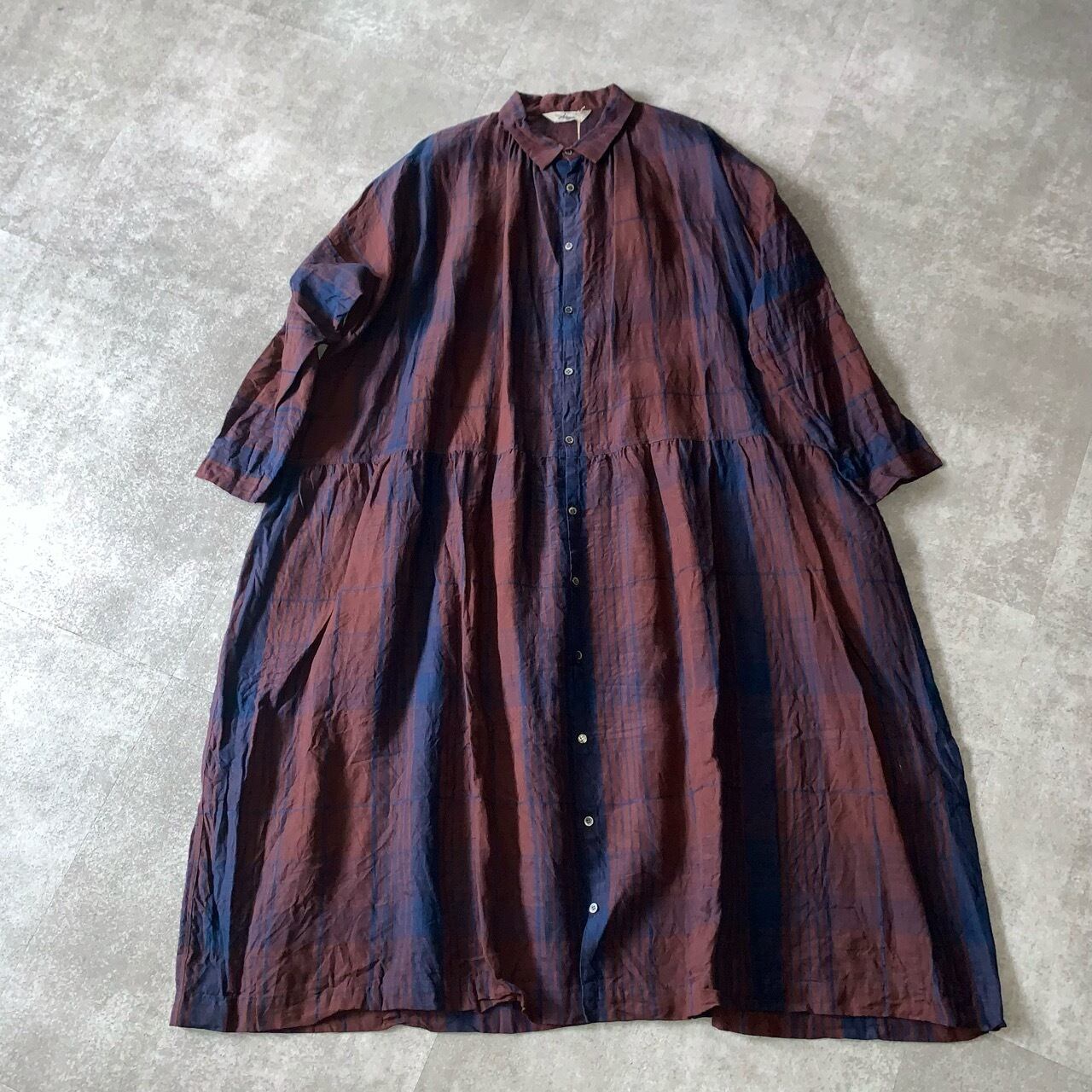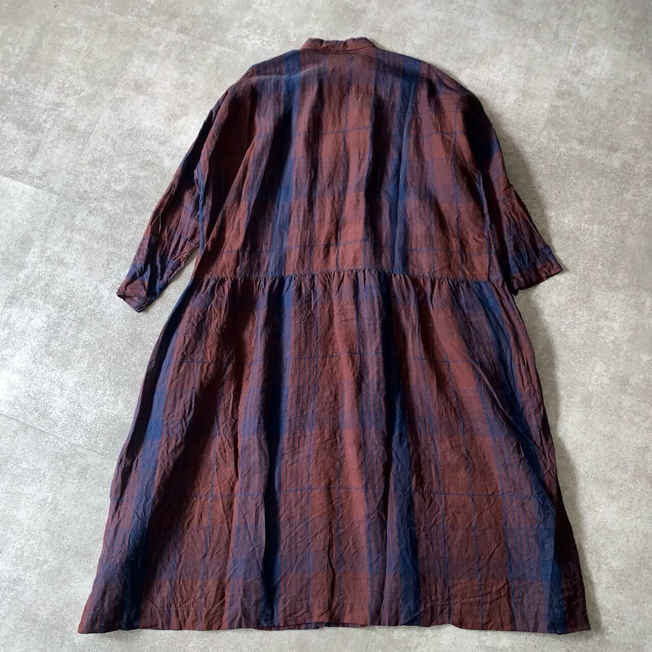 リネンの風合いが印象的なチェック柄ワンピースです。軽くてさらっとしたリネン地はシーズン通して着られる風合いで、深みのあるトーンのチェックがニットやアウターにも馴染みます。