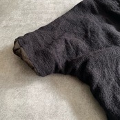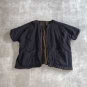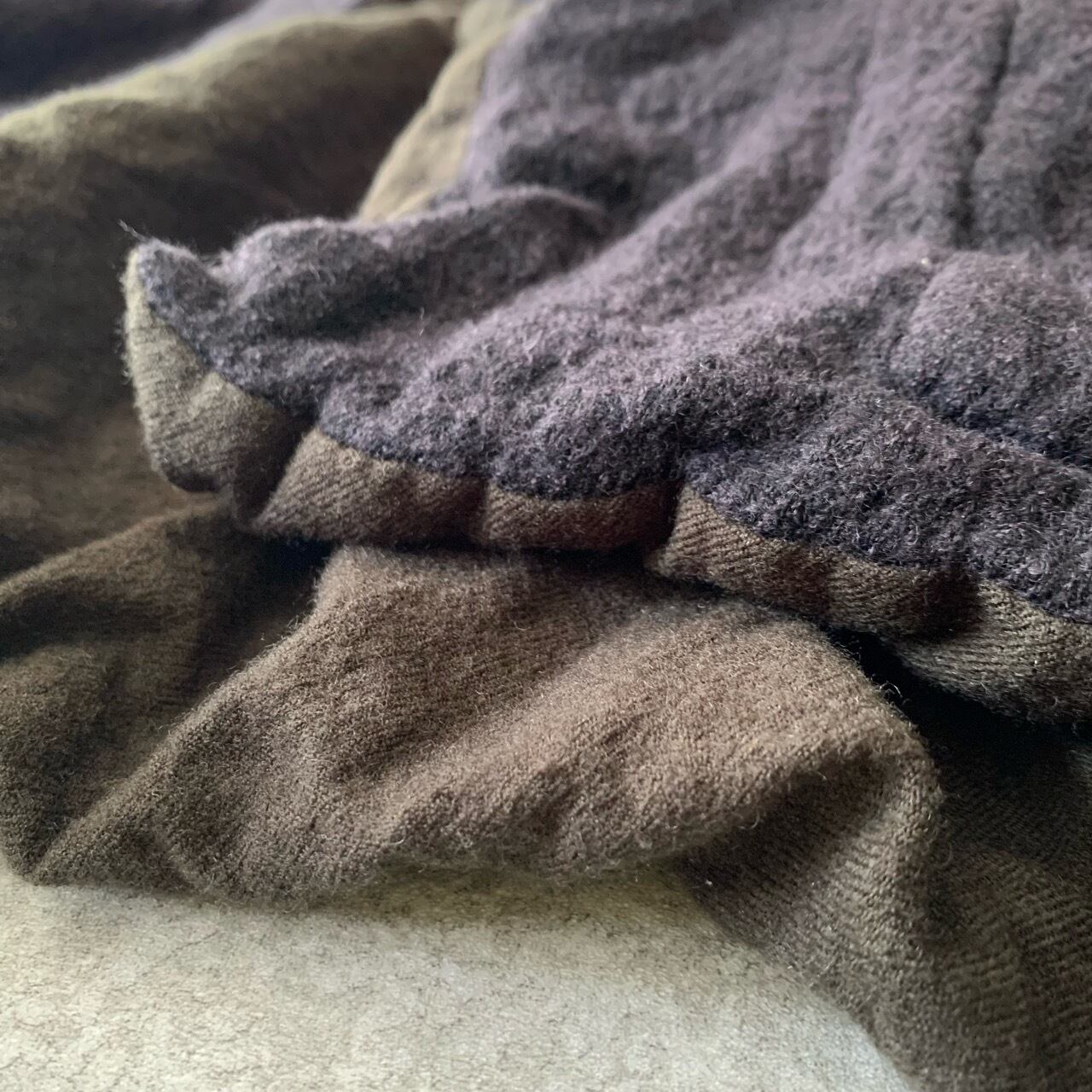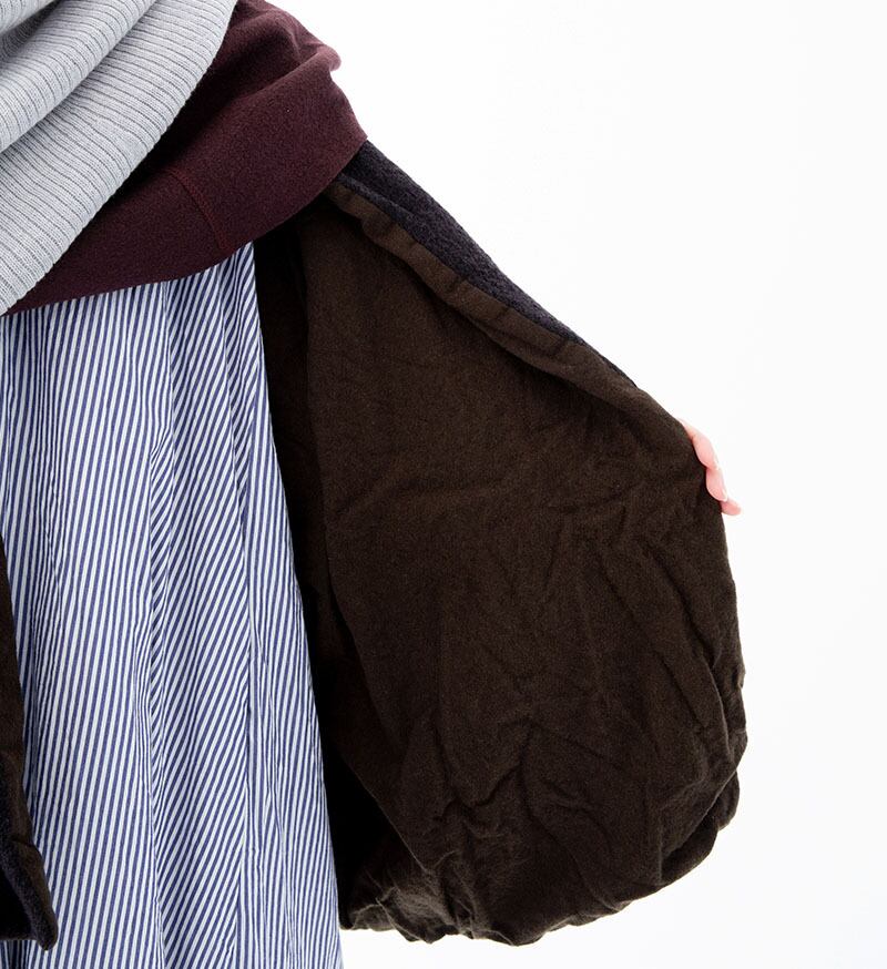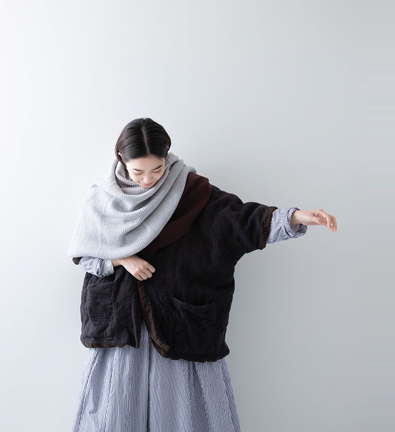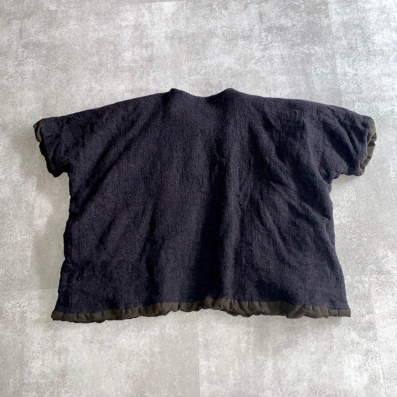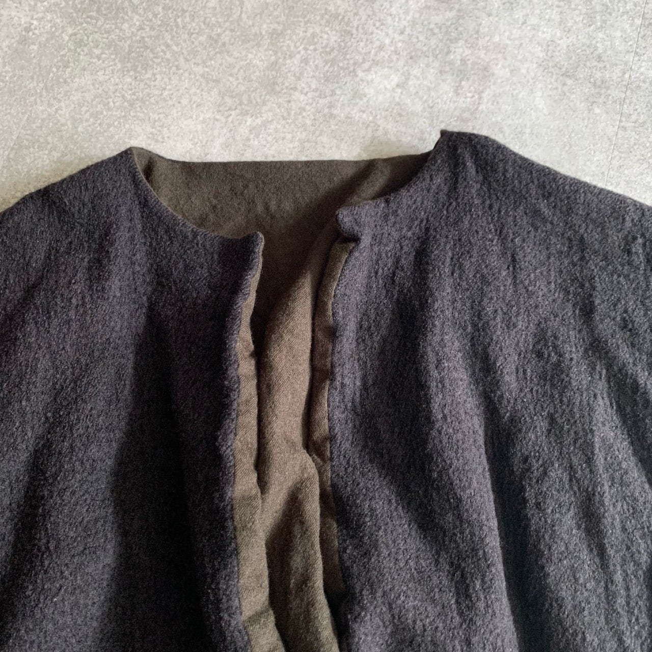表裏に異なるウール素材を用い、リバーシブルで着用できるショートコートです。縮絨加工を施した生地はさらに製品洗いを掛けることで目が詰まり、立体感のある風合いに仕上がっています。ストールピンが付いており、その留め方で様々な着こなしが愉しめる1着です。