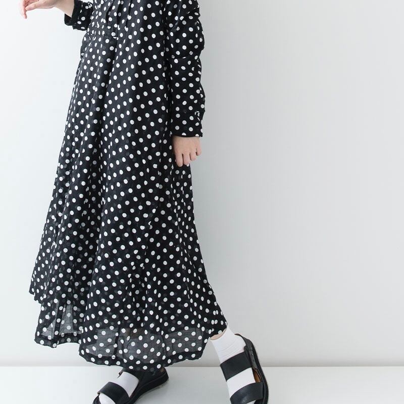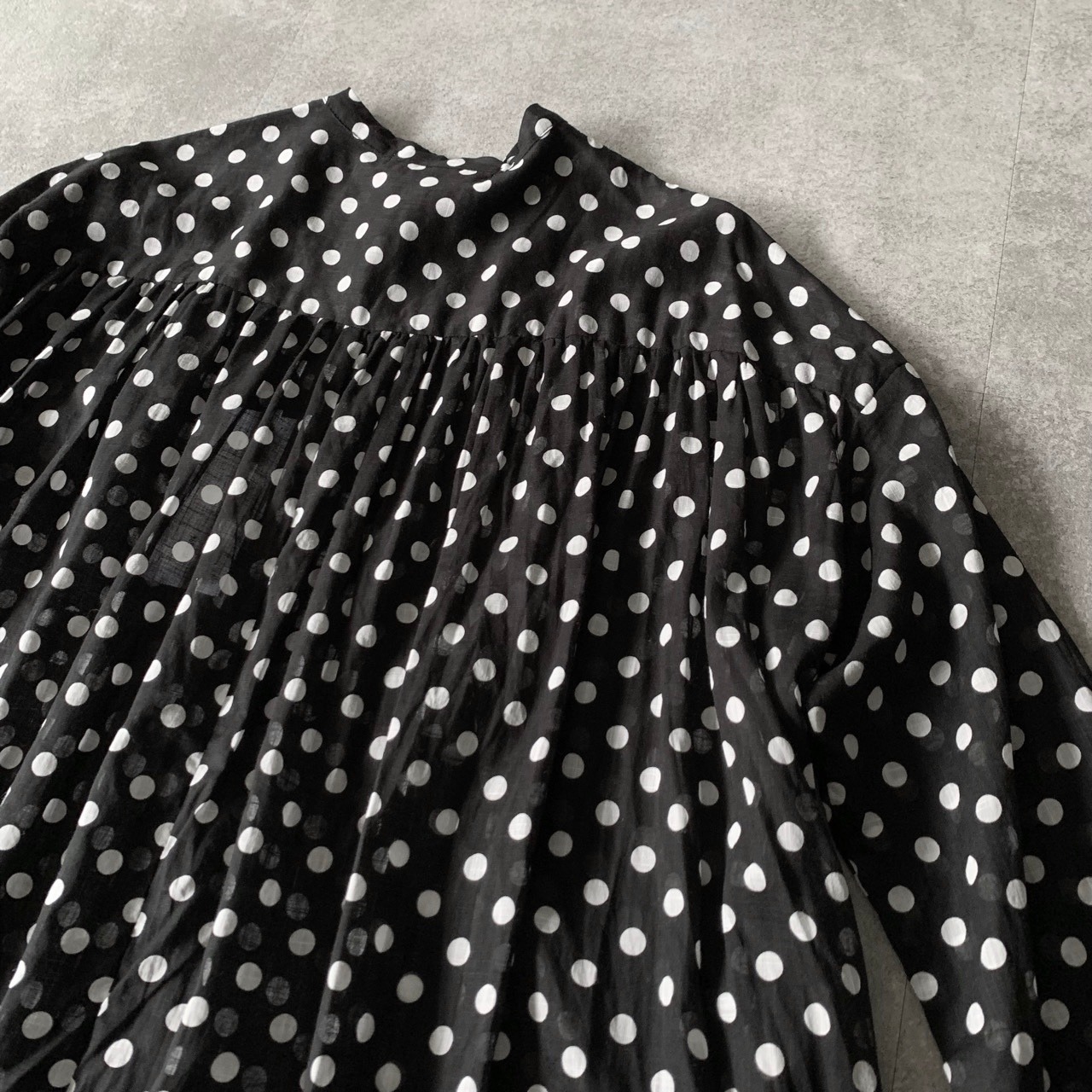 春夏らしい透けのあるドット柄のシャツワンピースです。生地にはオリジナルで製作したコットンラミーのスラブローンを使用しています。軽く、さらりとした肌触りが魅力です。前にはタック、後ろにはギャザーを配し程よいボリュームに仕上げました。ポケット付きです。