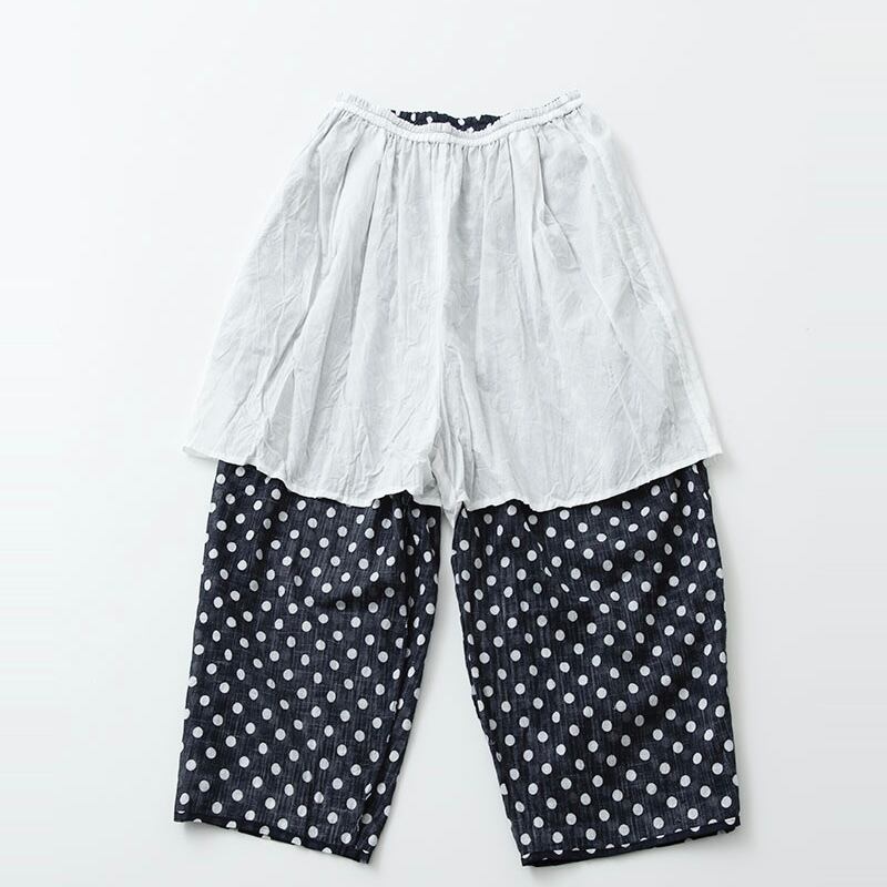 春夏らしい透けのあるドット柄のパンツです。生地にはオリジナルで製作したコットンラミーのスラブローンを使用しています。軽く、さらりとした肌触りが魅力です。膝丈の裏地が付いています。