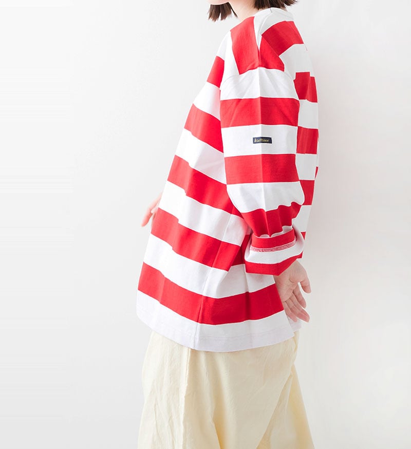 Le minorとVeritecoeurのダブルネームアイテムのカットソーです。ROUGE×BLANCは新色となっております。1922創業フランスの港町Lorient(ロリアン)に、漁師のための防寒着よりスタートした歴史あるブランド。Guidel(ギデル)へ場所を移した現在も生産全工程を自社工場にて完結することにこだわり、伝統と地域の雇用を守り続けることをブランドの柱としています。