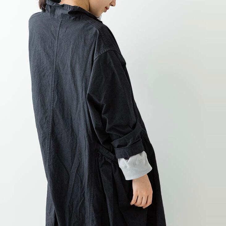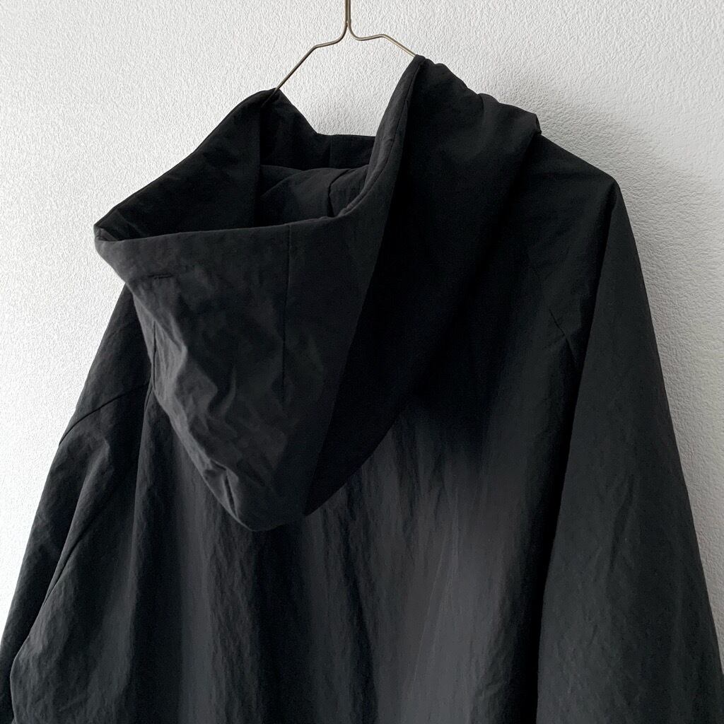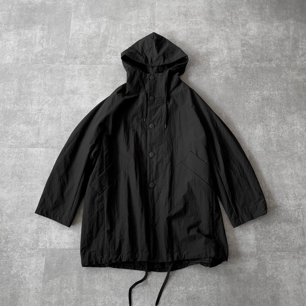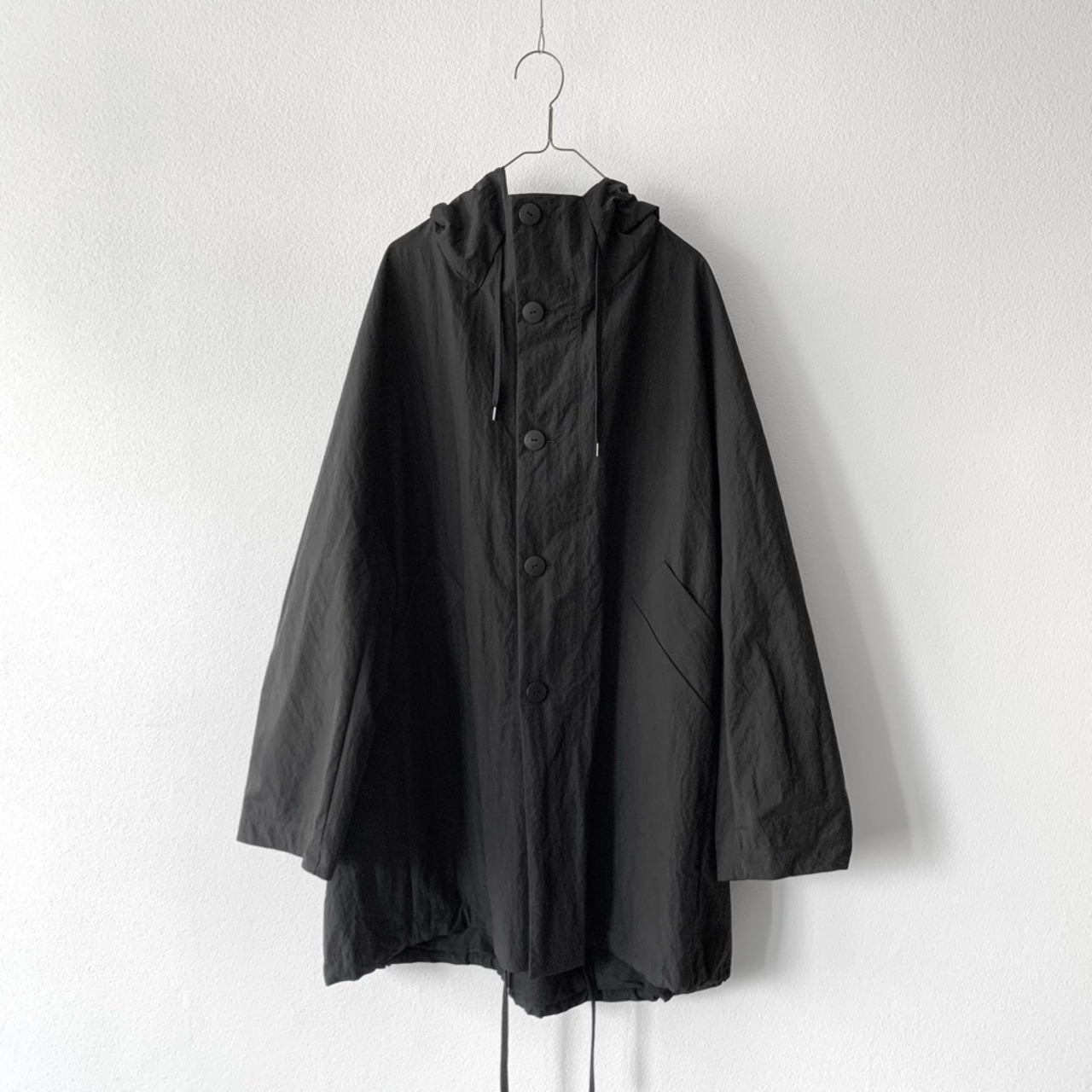 コットンナイロンの撥水生地を使用したフードコートです。身体を包み込むオーバーサイズのシルエットです。肌触りの良いコットンの裏地付きです。