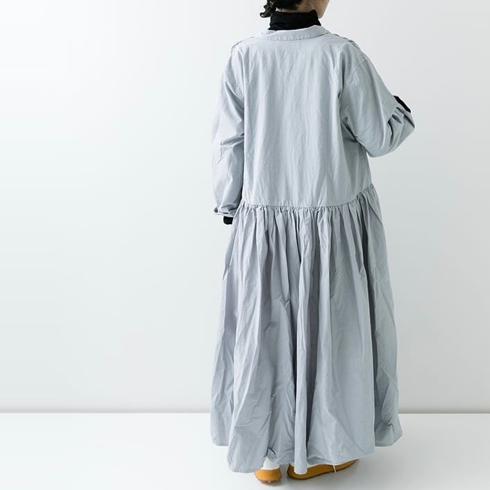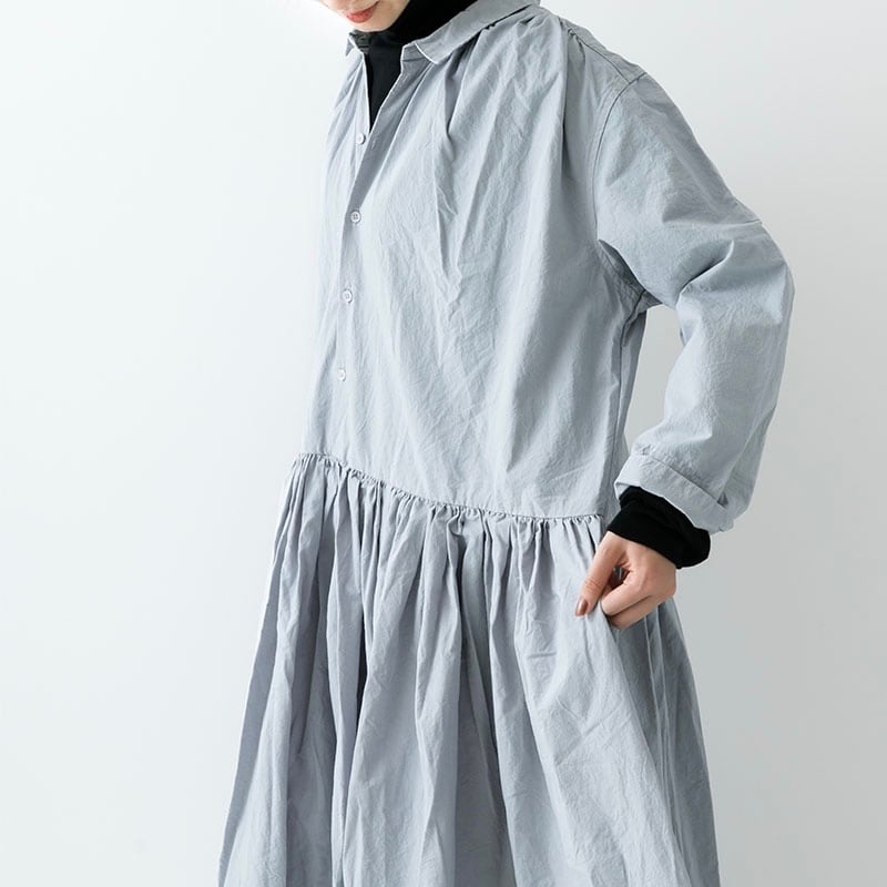 コットンラミーのウェザー生地を使用したワンピースです。ドライな肌触り、かつ柔らかな質感が特徴です。衿ぐりや肩回りにギャザー、ウエストにはタックギャザーをたっぷりと施し、ふんわりとボリュームのあるシルエットに仕上げています。サイドポケット付きです。ジャケットとのセットアップもおすすめです。