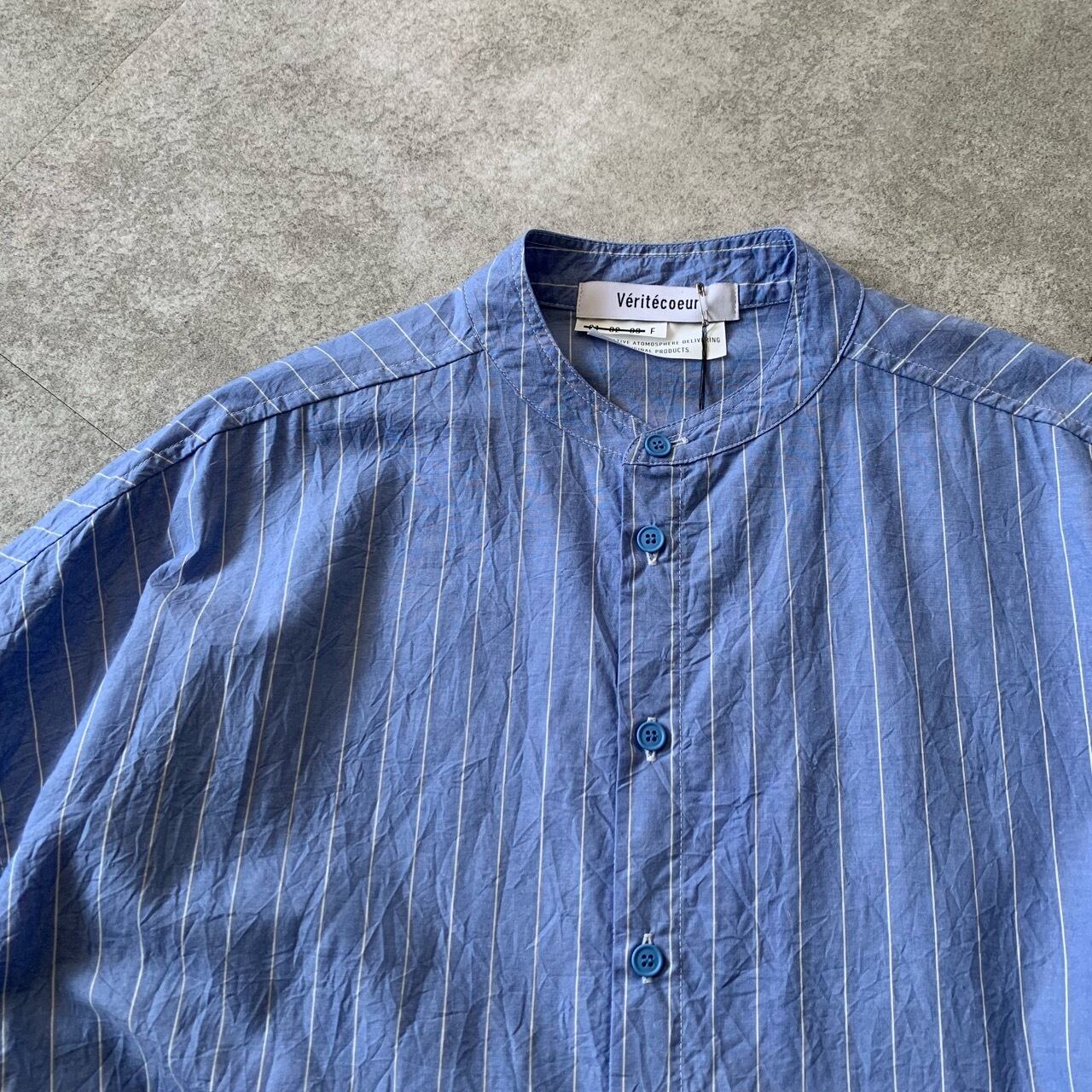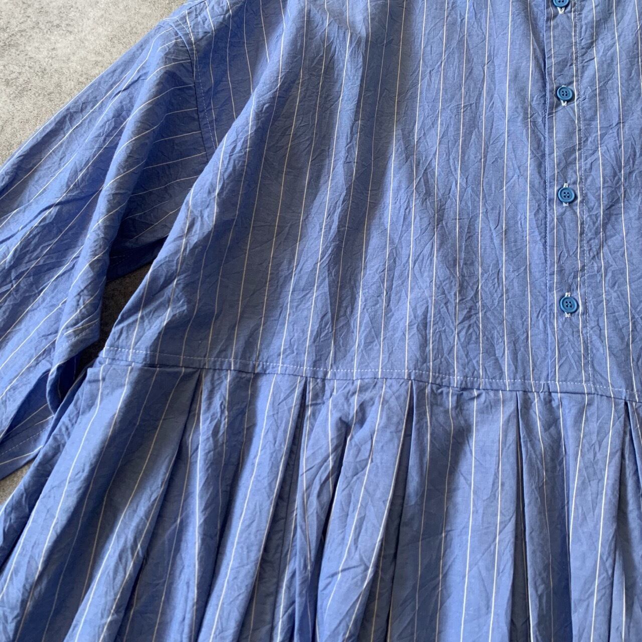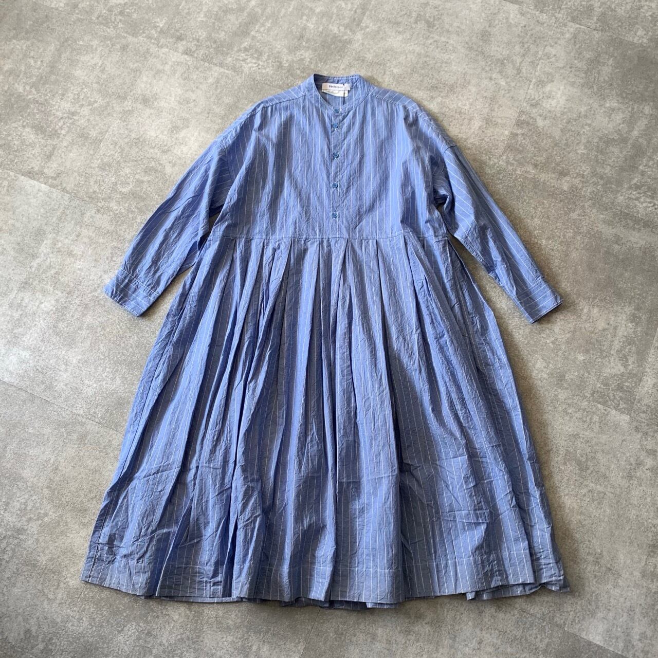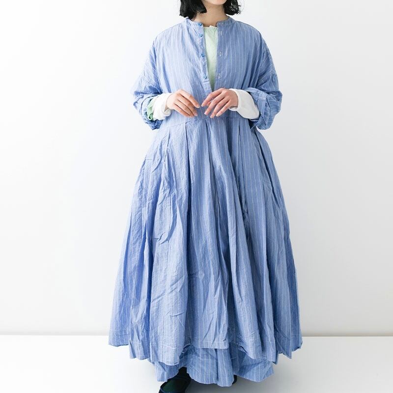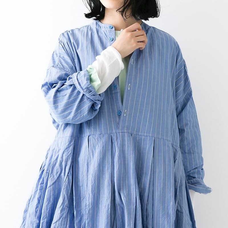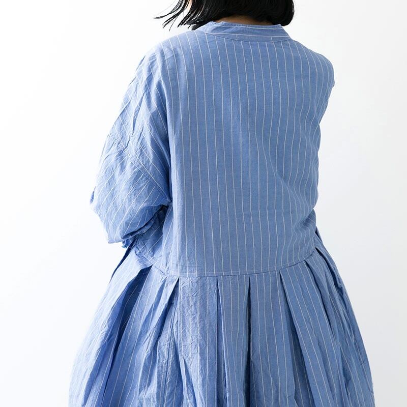 オリジナルのコットンラミー生地を使用したワンピースです。生地にキャッチワッシャー加工を施し、柔らかな皺のあるラフな表情に仕上げました。ウエストの切替にボックスタックをぐるりと配し、ボリュームのあるシルエットに仕上げています。衿元はすっきりとしたスタンドカラーです。