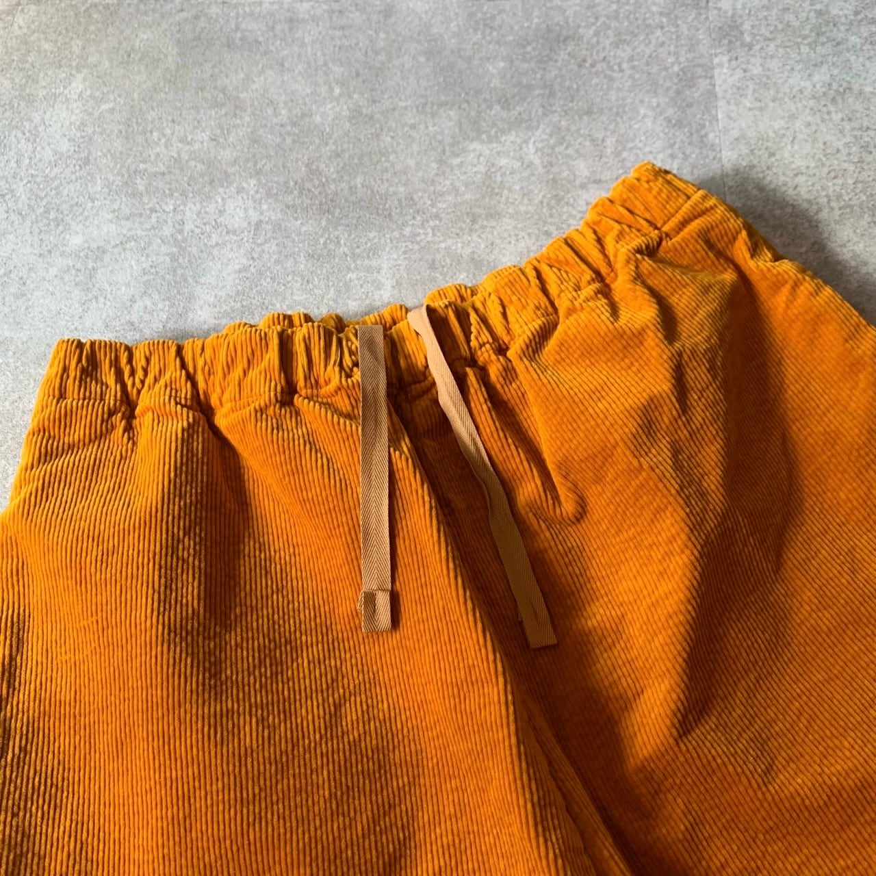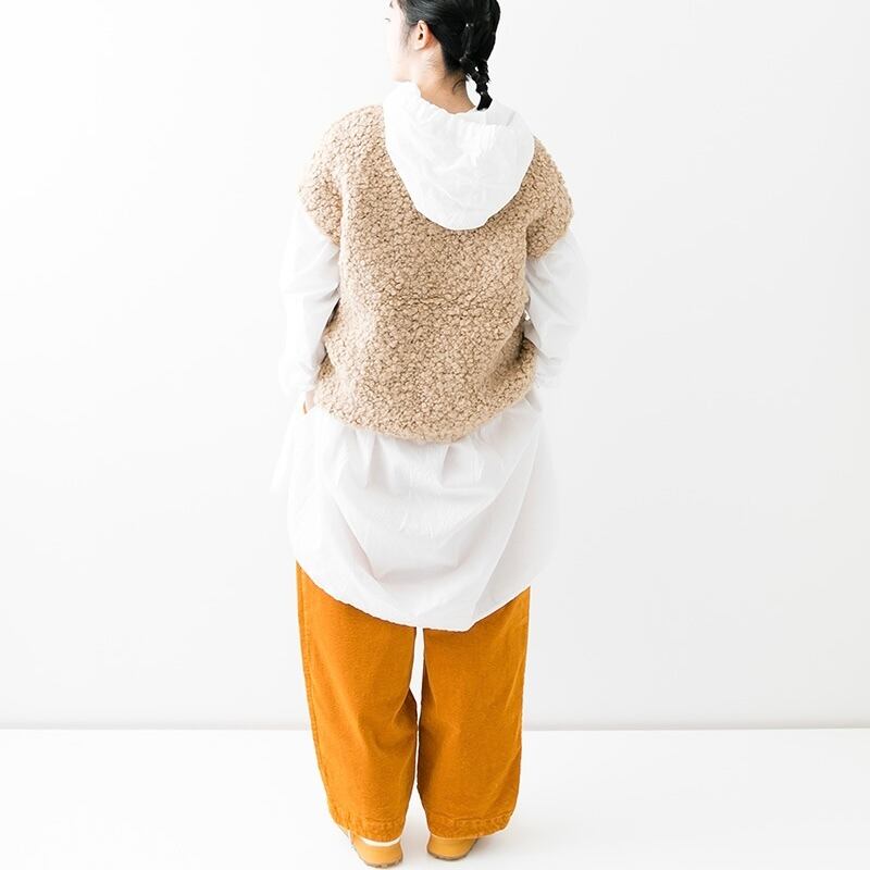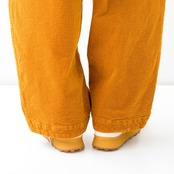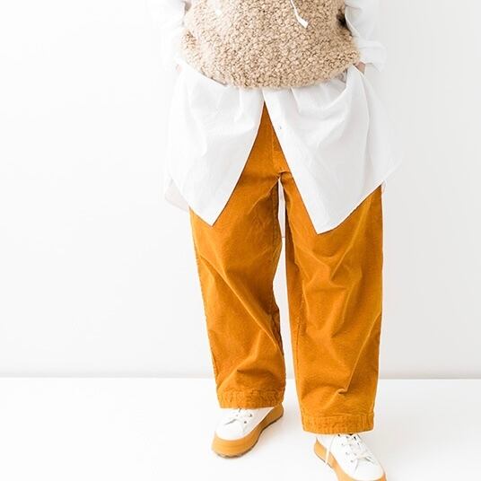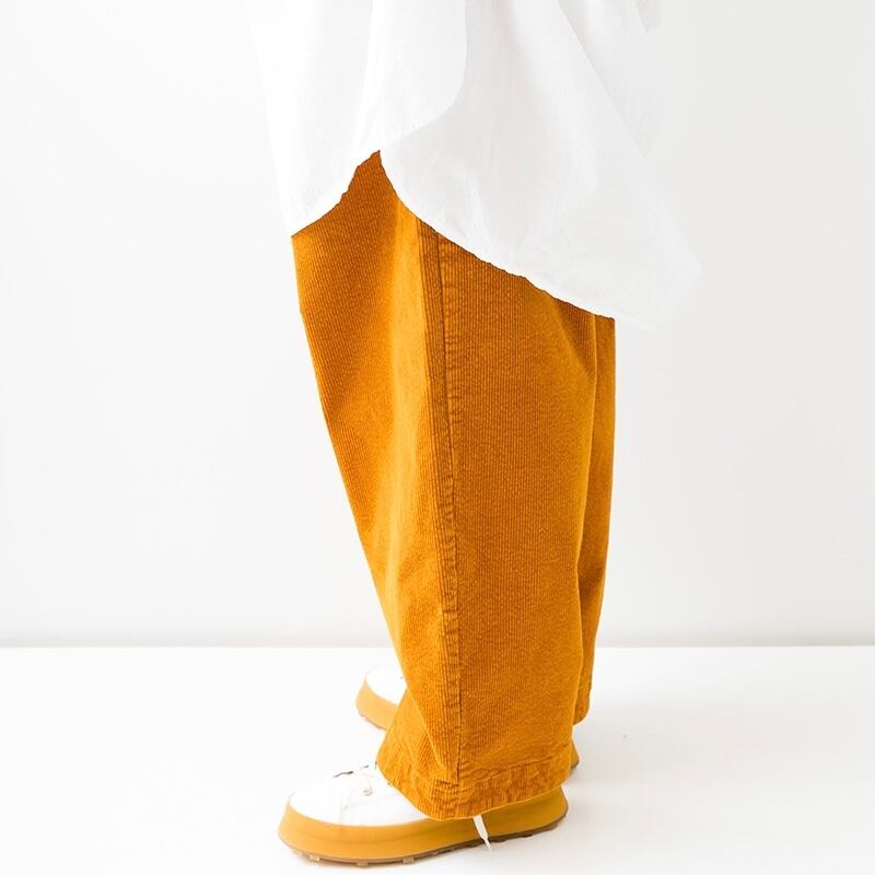 太畝のストレッチコーデュロイ生地のパンツです。オーガニックコットンを使用した適度な光沢とハリがある素材です。製品染めをすることでカジュアルな印象に仕上げています。ゆったりとした腰回りから、裾に向かってテーパードさせた丸みのあるシルエット。ウエストはゴム+紐のイージースタイルです。ヒップと両サイドにポケット付きです。