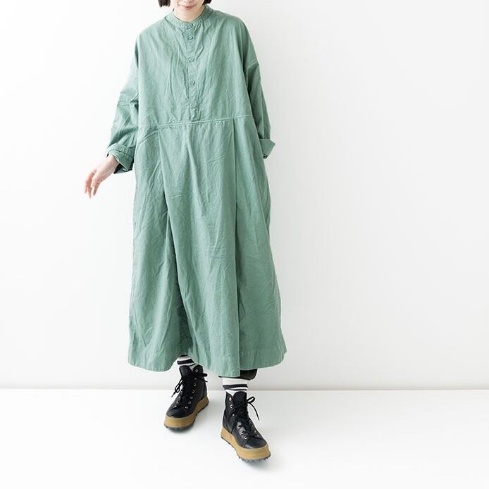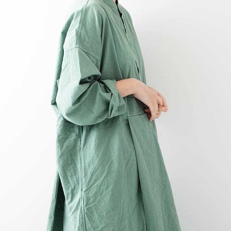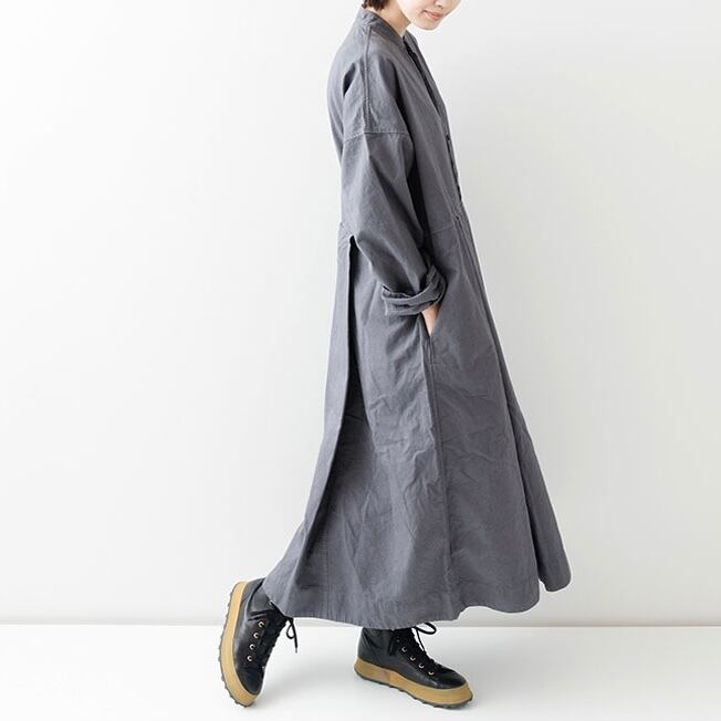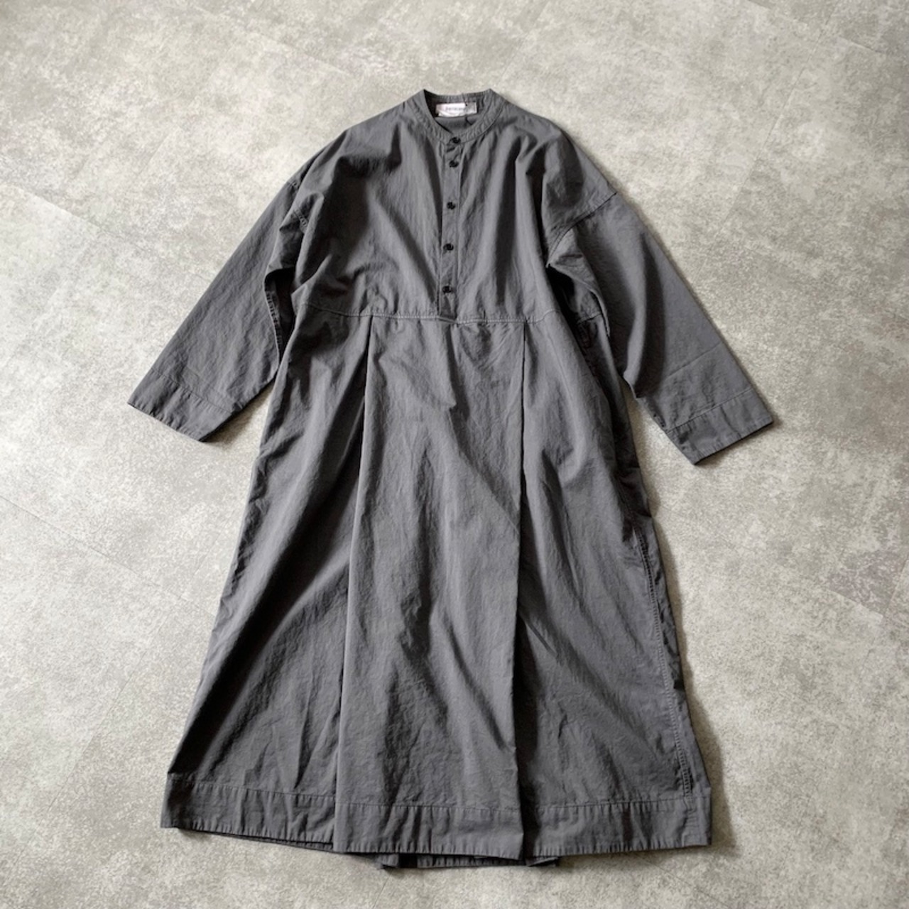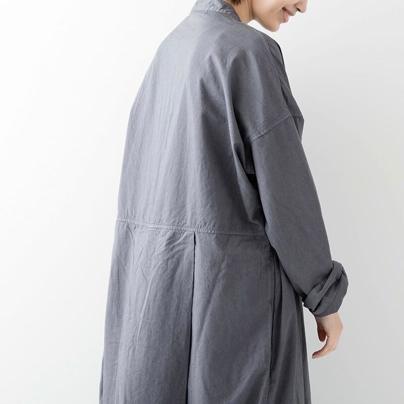 コットンサテンにピーチ加工を施した生地でお作りしたワンピースです。うっすらと起毛したしっとりとした肌触りが特徴です。大きく取ったボックスタックが印象的なワンピース。首元はスッキリとしたデザインですので、重ね着もし易やすく、季節を通して手にしていただける1着です。