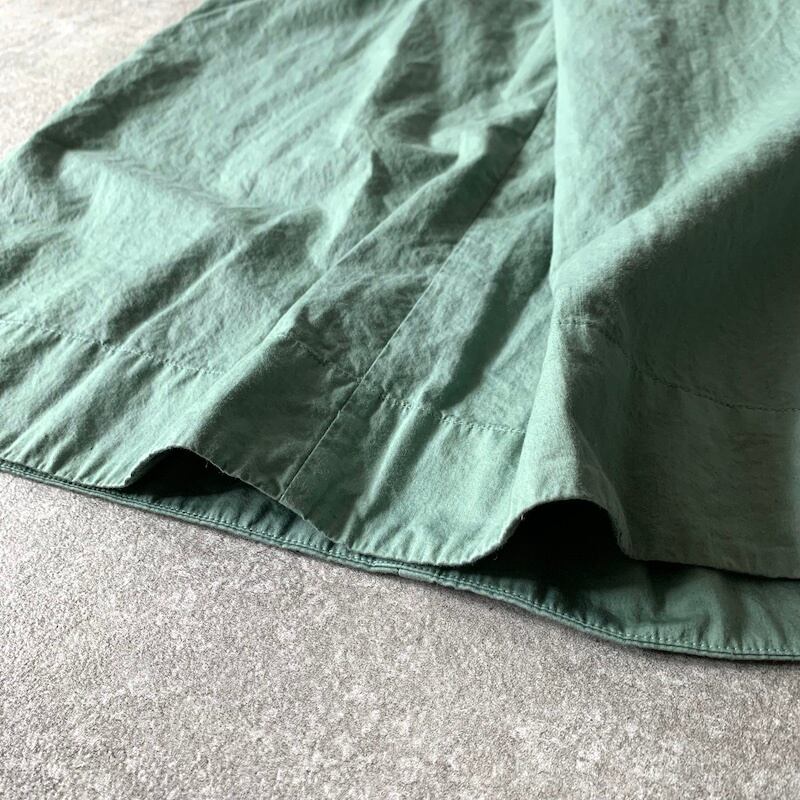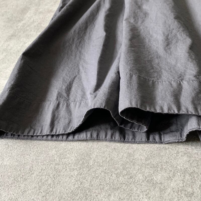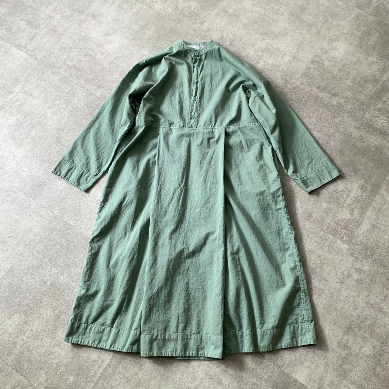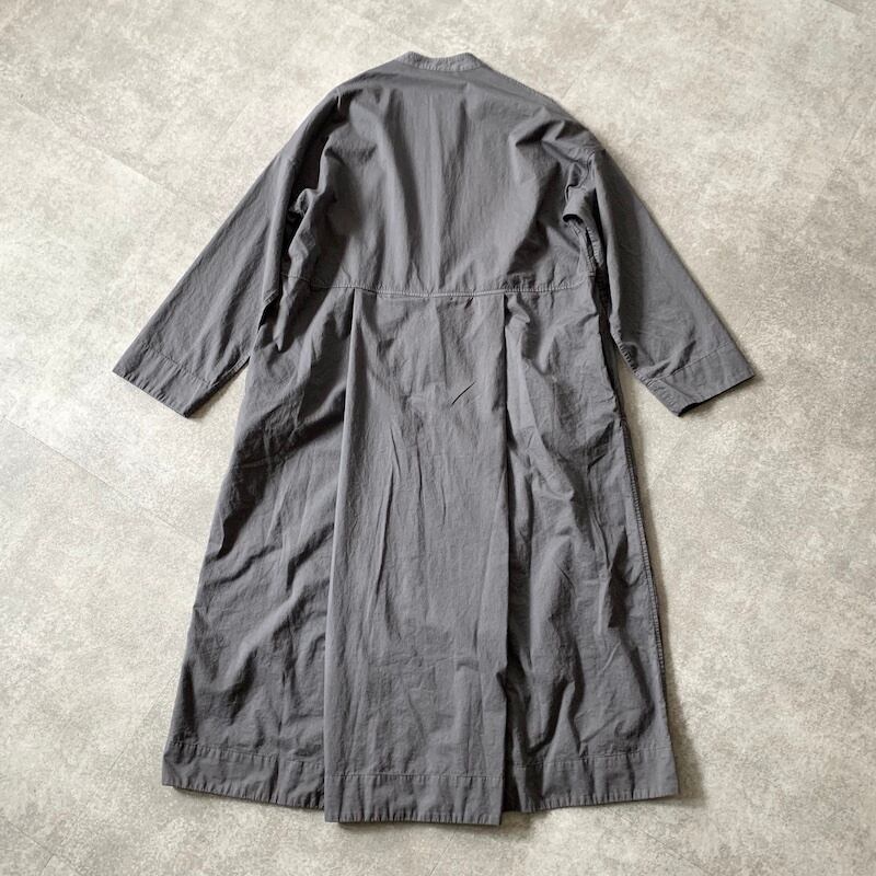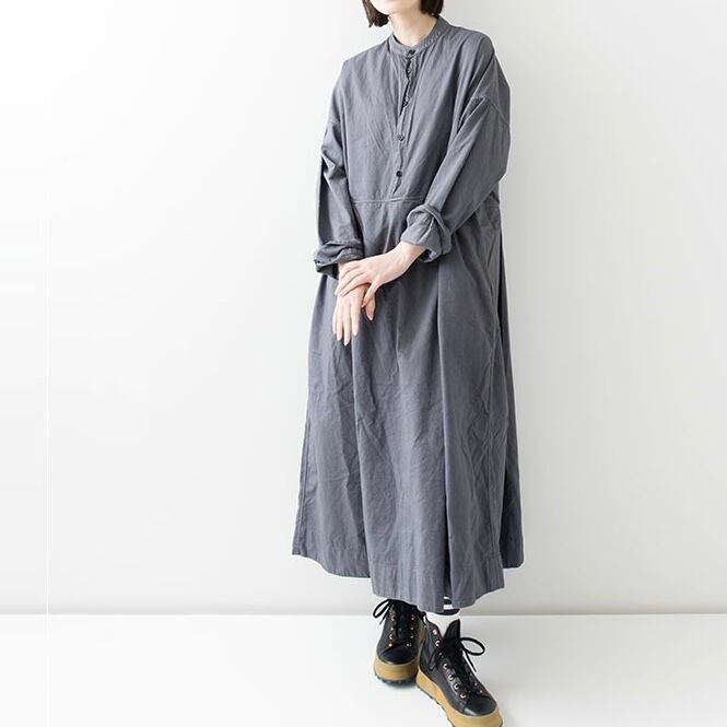 コットンサテンにピーチ加工を施した生地でお作りしたワンピースです。うっすらと起毛したしっとりとした肌触りが特徴です。大きく取ったボックスタックが印象的なワンピース。首元はスッキリとしたデザインですので、重ね着もし易やすく、季節を通して手にしていただける1着です。
