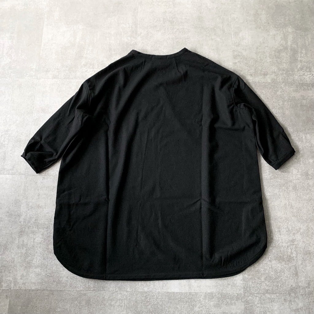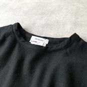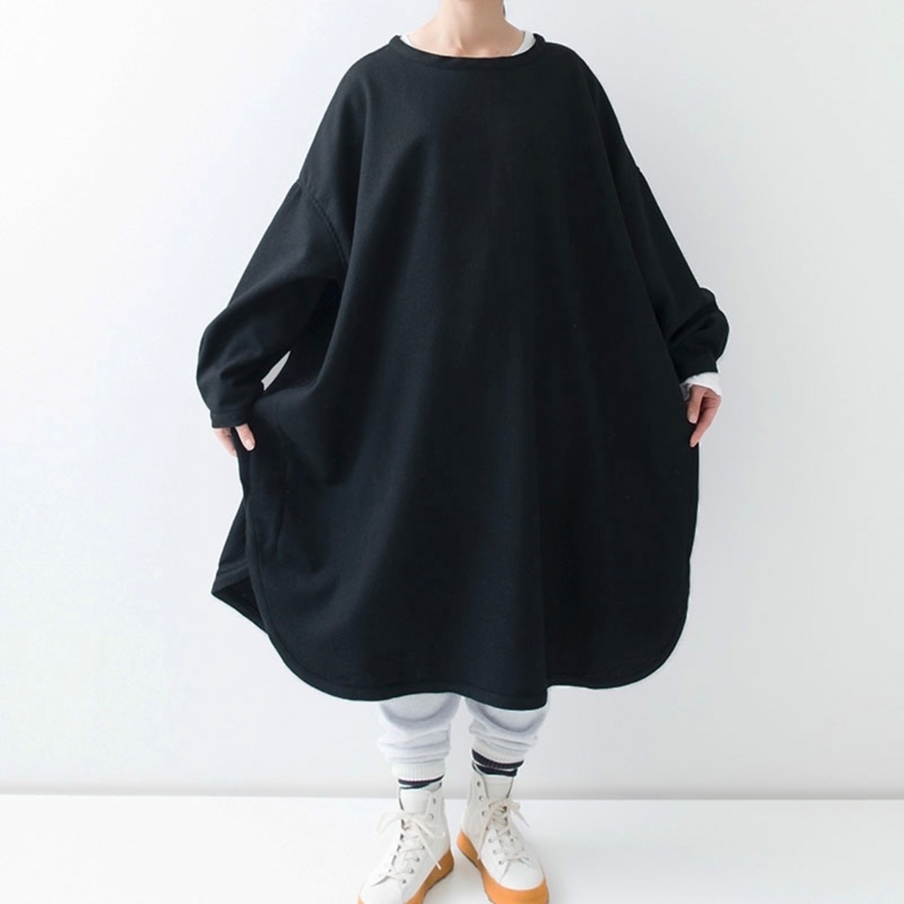 ラウンドした裾のラインが特徴のワンピースです。縮絨加工を施したウールのサキソニー生地を使用しています。軽く、ふっくらとした柔らかな肌触りです。肩回りや身幅にゆとりを大きく入れ、リラックス感のあるシルエットに仕上げています。