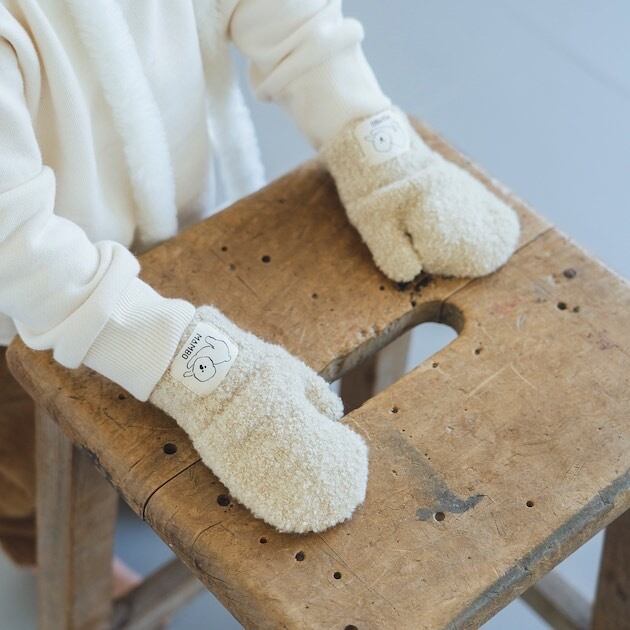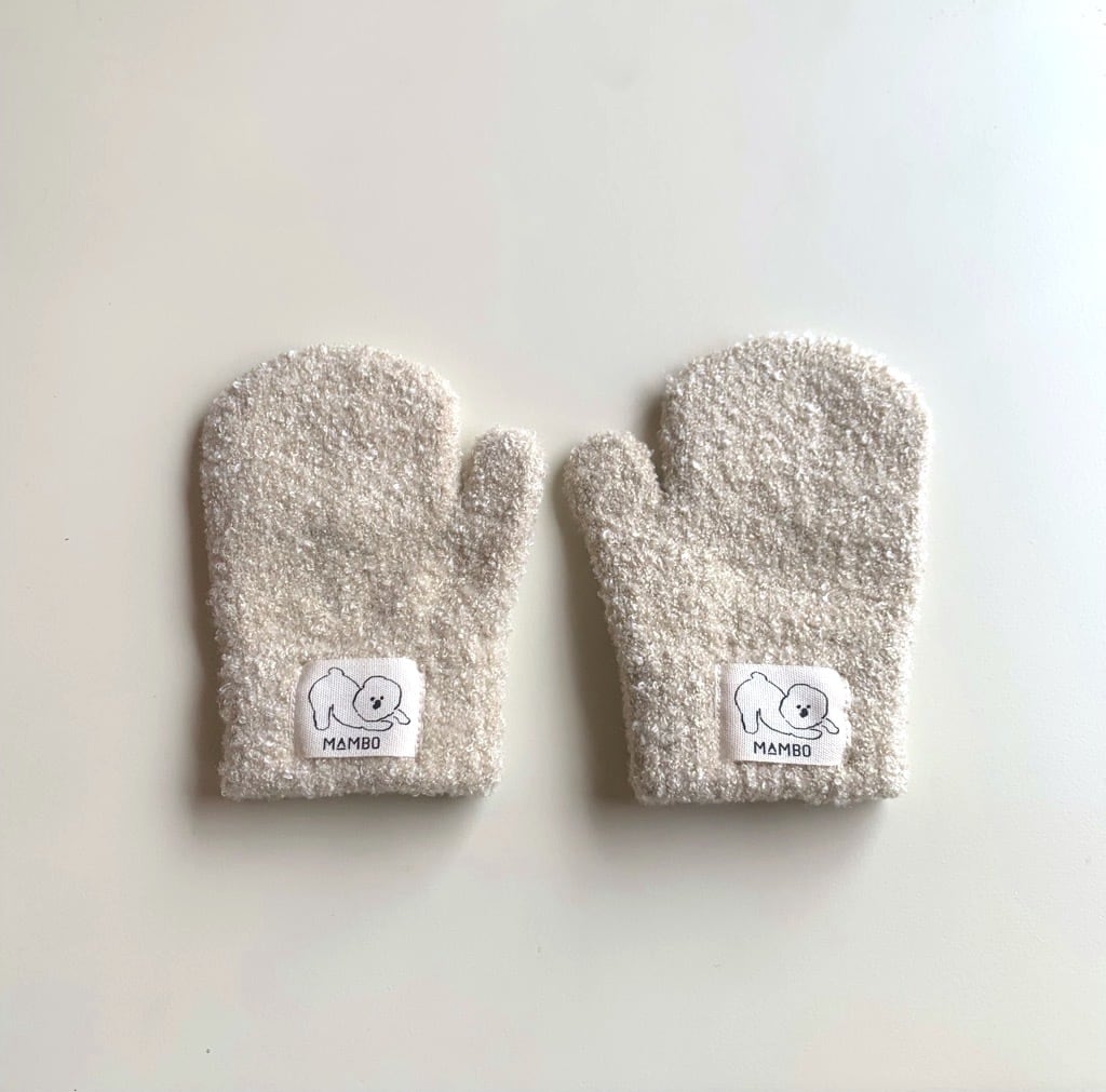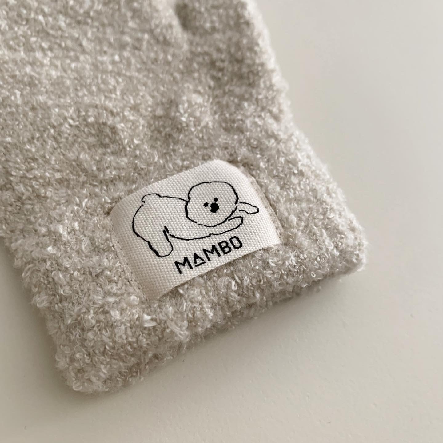 イラストレーター 塩川いづみさんの描いた、ビション・フリーゼという犬がモチーフ。人気の MAMBO が、お子さま用の手袋になりました!