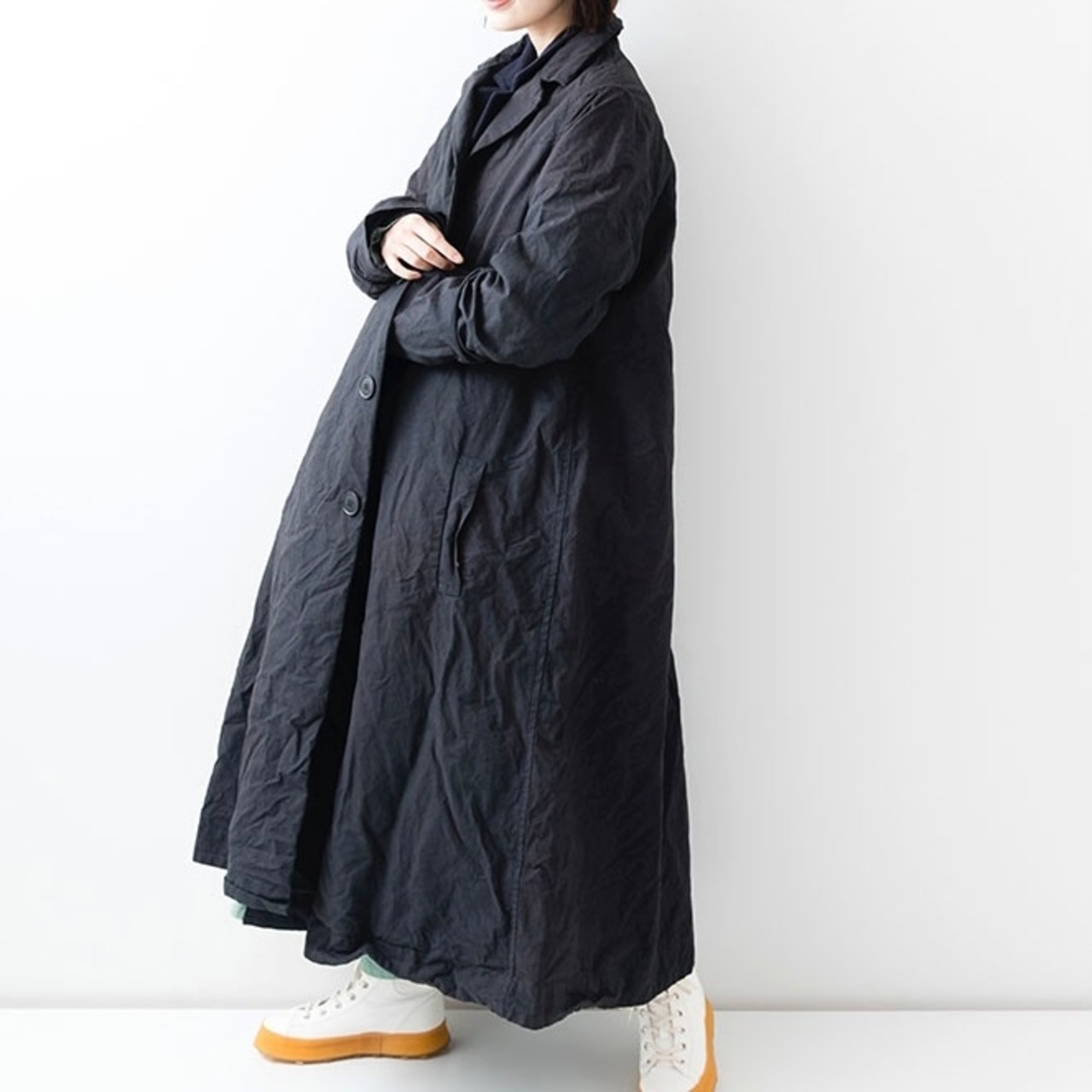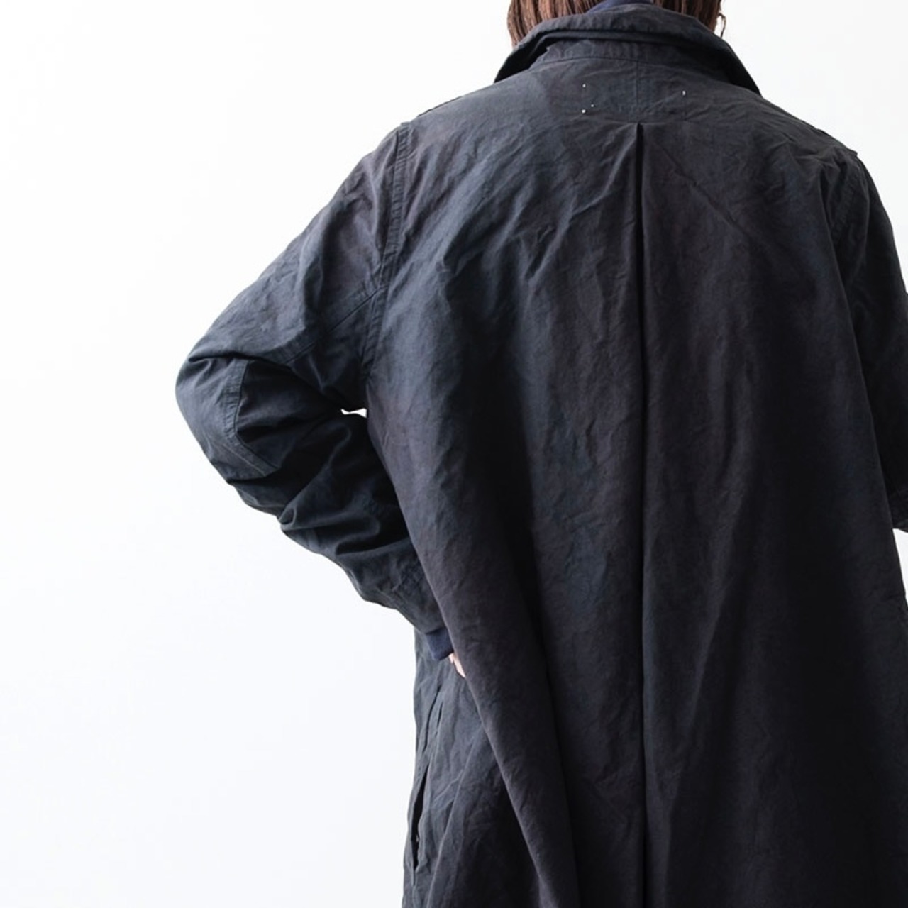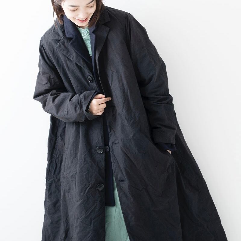 厚手のコットンウェザー生地を使用したコートです。製品染めによりパッカリングを起こさせ、カジュアルな雰囲気に仕上げています。後身頃に大きくプリーツを取ったAラインシルエットです。染め後に硬仕上げ加工を入れることで生地に強くハリを持たせ、シルエットを強調させています。