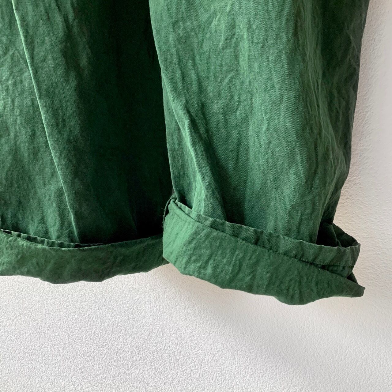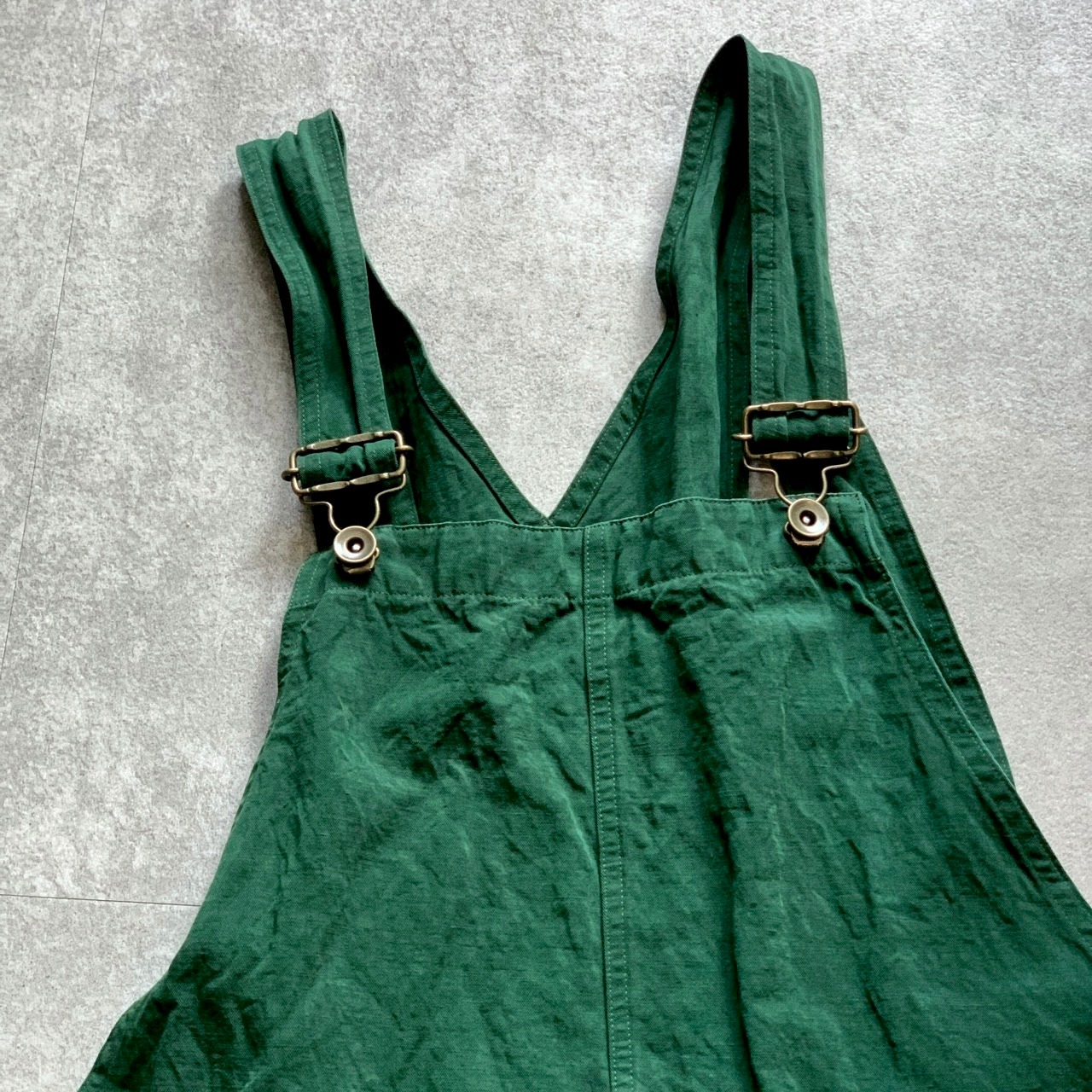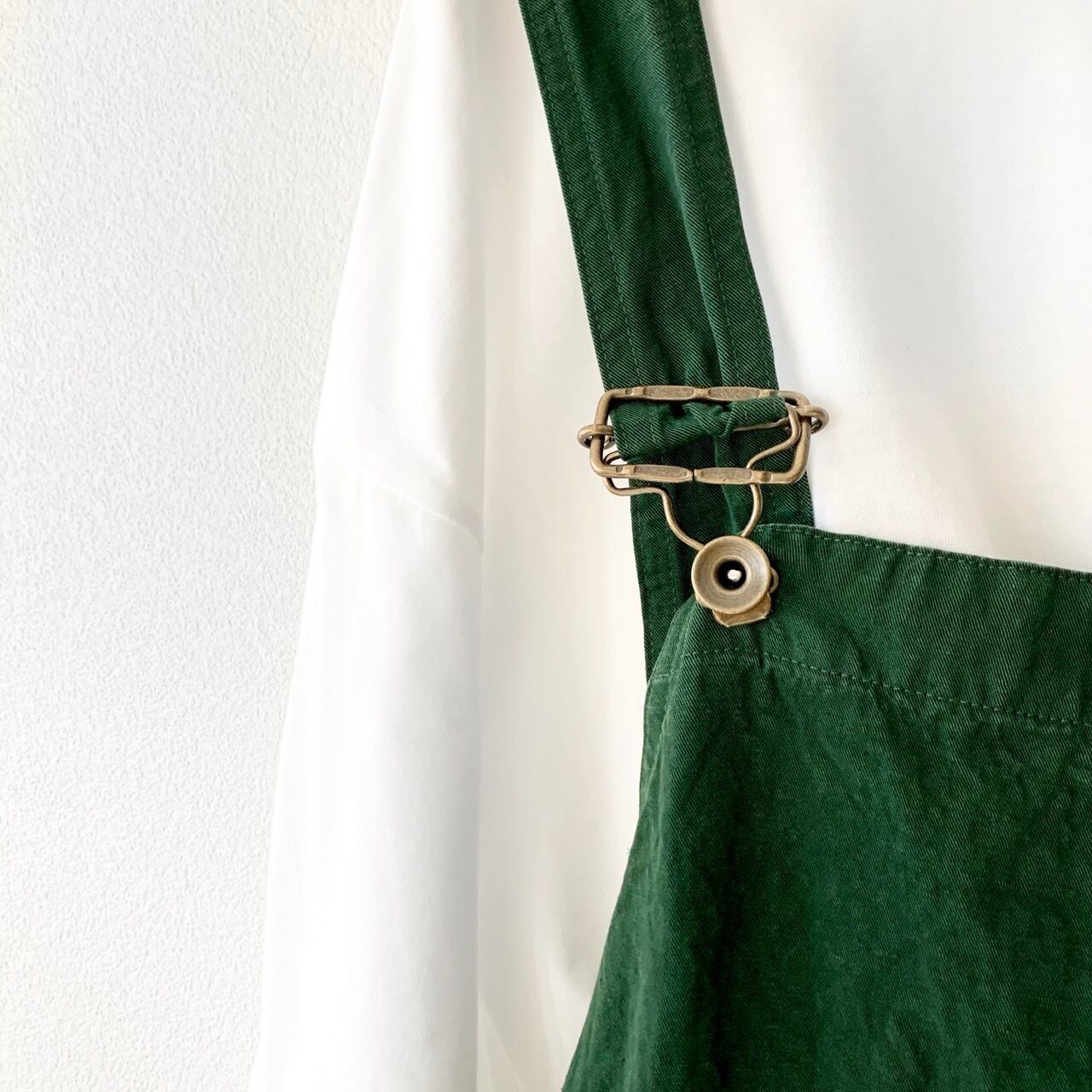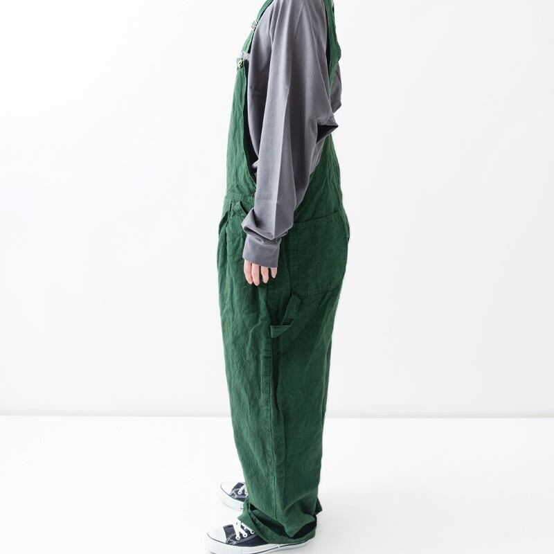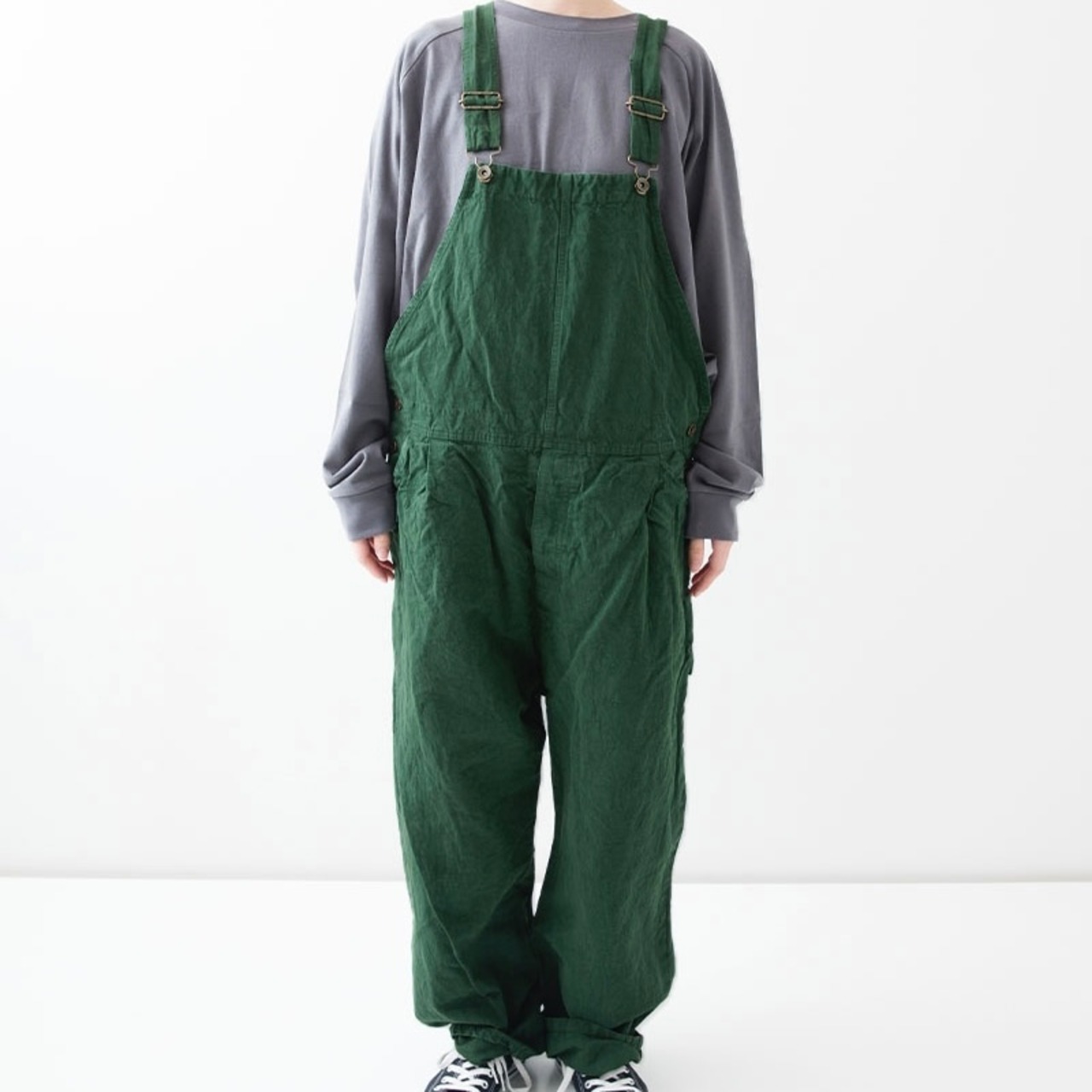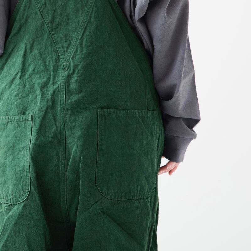 ふっくらとした風合いのコットンリネンギャバジン生地を使用したオーバーオールです。生地にワッシャー加工を施すことで、細かなシボのあるドライなタッチに仕上げています。薄すぎず厚すぎず、名前の通りジャストライトな(ちょうどよい)オーバーオールを目指しました。また硫化染めを用いることで、着て洗ってを繰り返すうちに色が抜けてゆき、独特な風合いと味わいが増すのも魅力です。