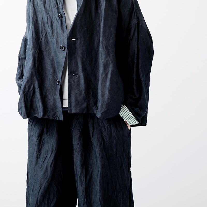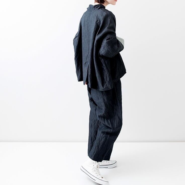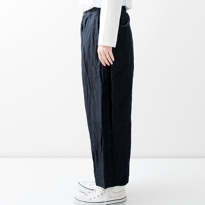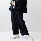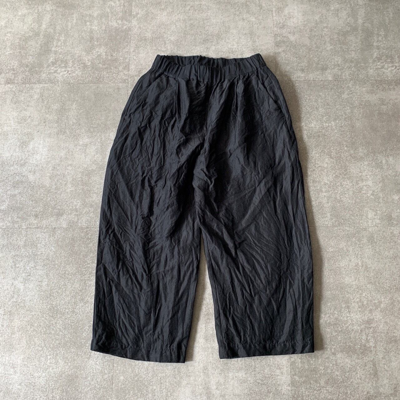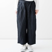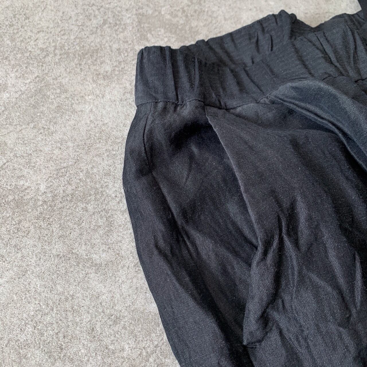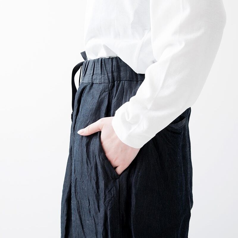 控えめな光沢とシャリのある質感が特徴のへリンボン生地を使用したパンツです。洗いを掛けることでパッカリングを起こさせ、カジュアルな雰囲気に仕上げています。腰回りにゆとりを持たせ、裾に向かって緩やかにテーパードしたシルエットです。ウエストはゴム+紐によるリラックスした着心地です。