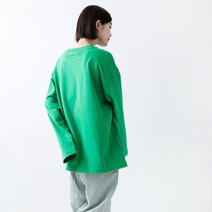 ユニセックスでお作りしたロングスリーブカットソーです。編み目の密度を詰めて編みたてた、コシがありしなやかな手触りの生地に、特殊な柔軟加工であるグレース加工を施し、上品な光沢感と柔らかな風合いをプラスしました。洗濯しても型崩れしづらいのが特徴です。