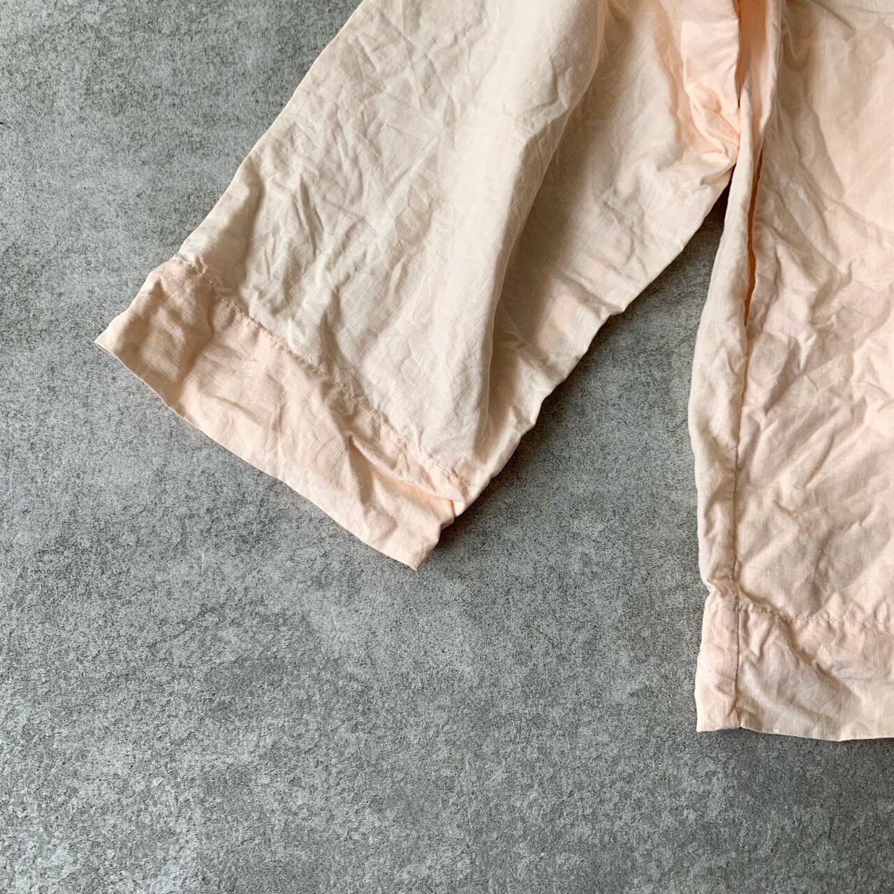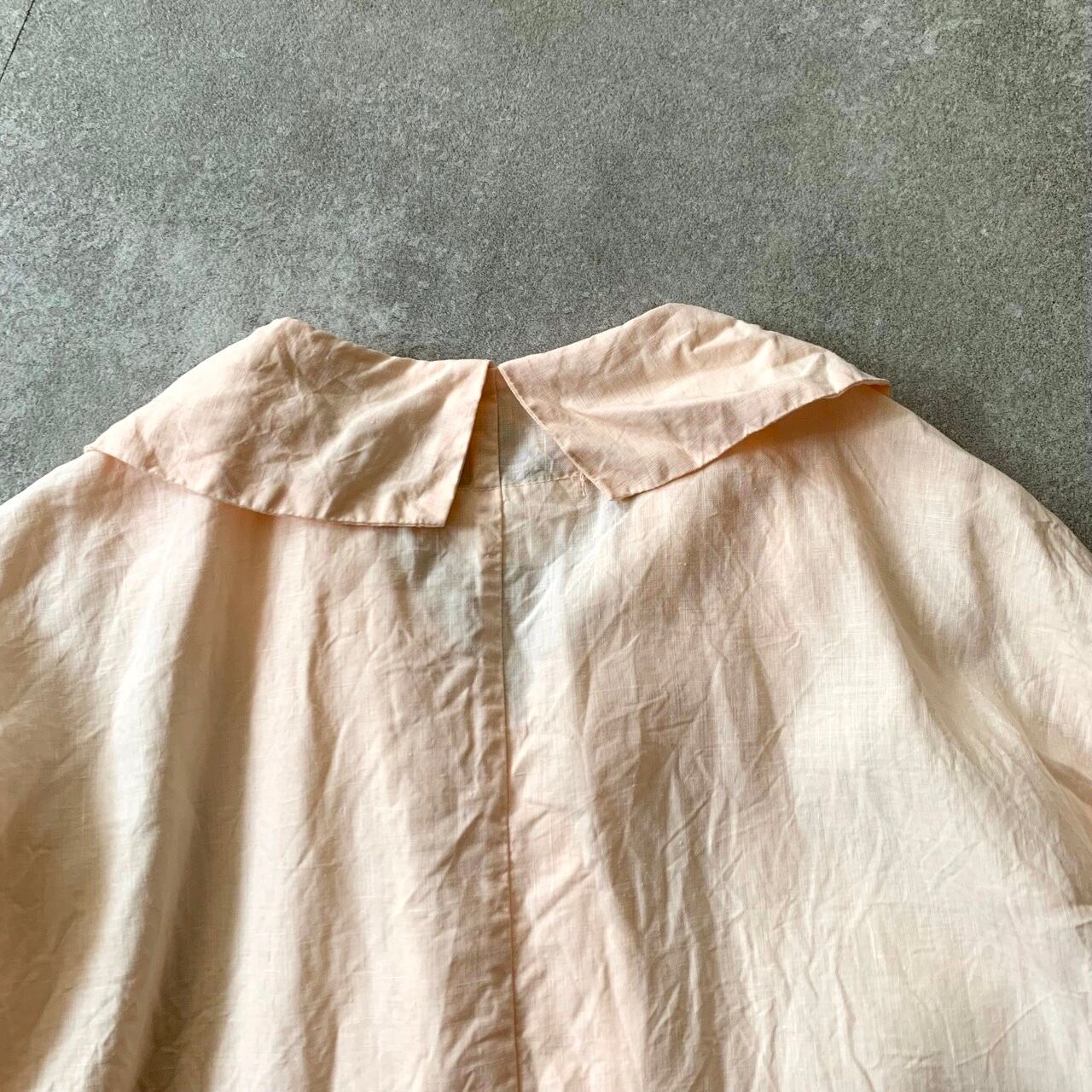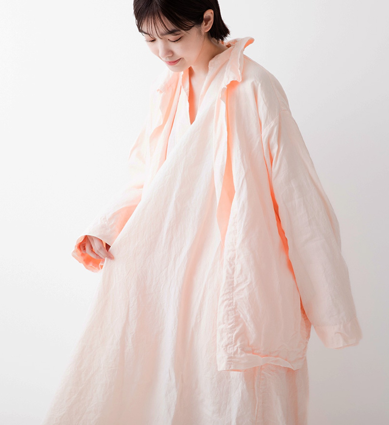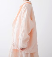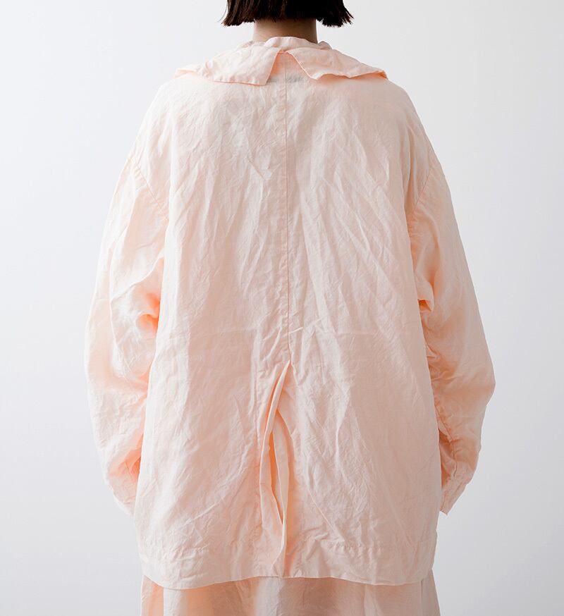 軽い羽織ものとしておすすめしたいボタンレスジャケットです。シャリ感のあるドライタッチなリネン素材を使用しました。製品染めをすることで細かなパッカリングを起こさせ、ラフな表情に仕上げています。天然染めによる深く柔らかな色合いも魅力です。