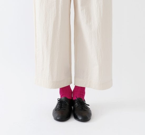 ざっくり感があり履き口の編み方に変化を付けた、リブのカラーソックスです。シルケット加工を施した毛羽が少なく光沢感のある綿糸を使用し、厚手に編み立てました。カジュアルスタイルの差し色におすすめの1足です。