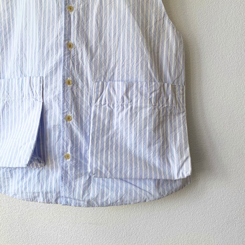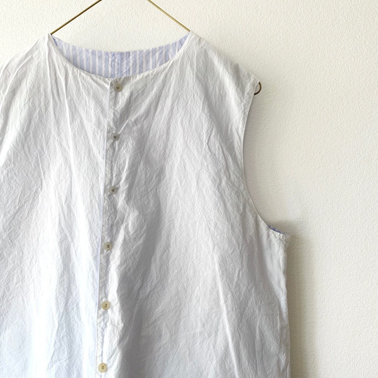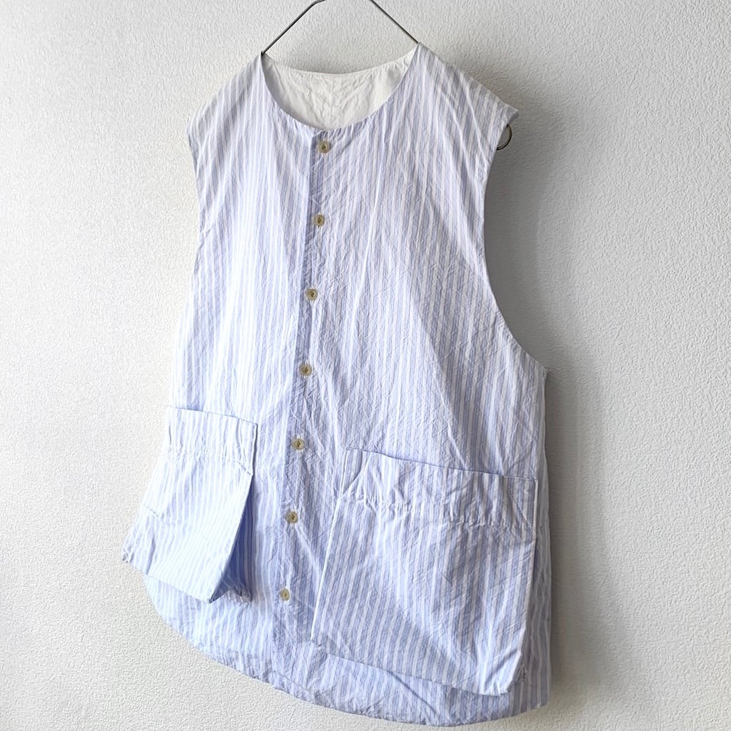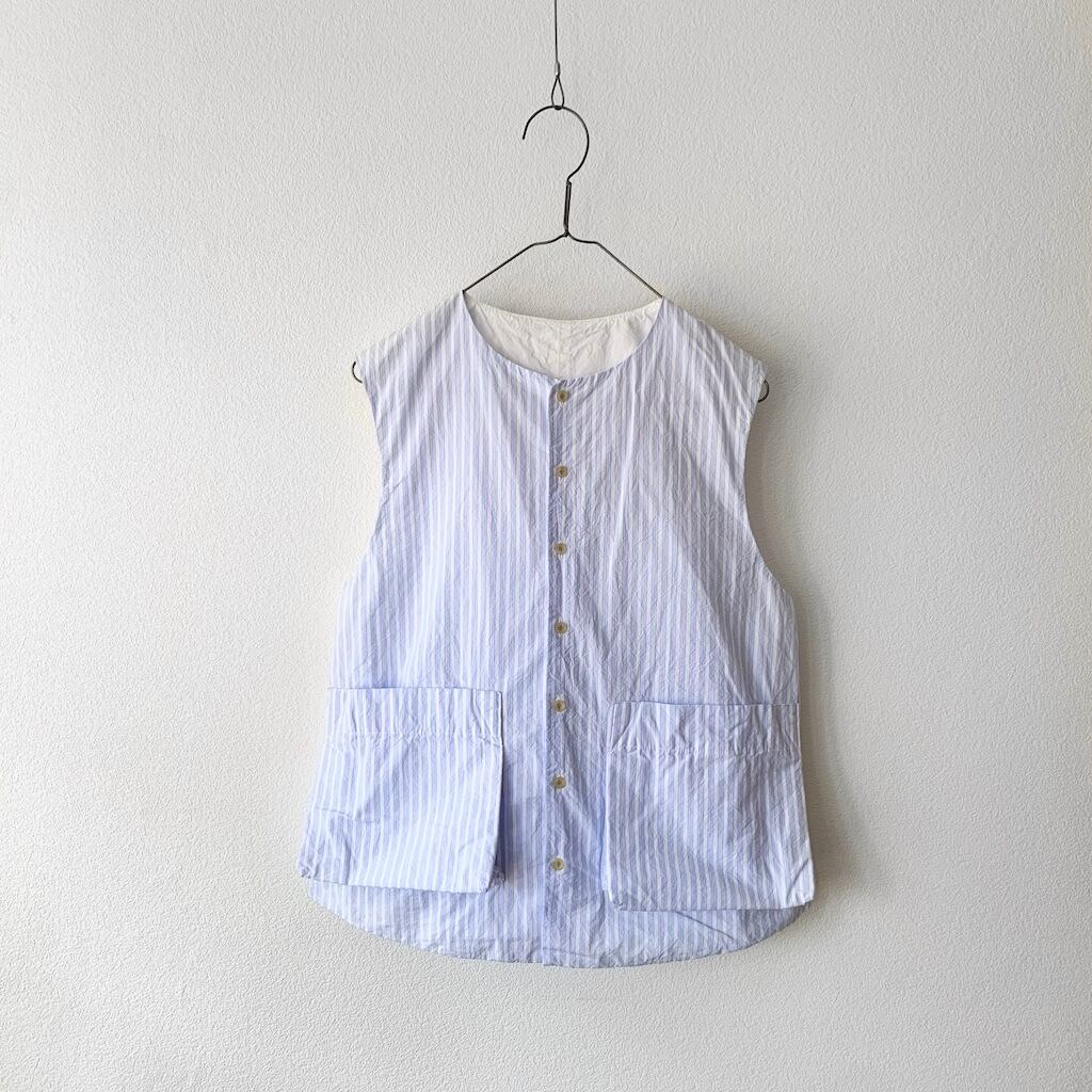 表裏リバーシブルで着用可能なベストです。生地にはワッシャー加工を施し、細かな皺のあるラフな表情に仕上げています。小ぶりな10mm釦を採用し、軽く華奢な雰囲気に仕上げました。