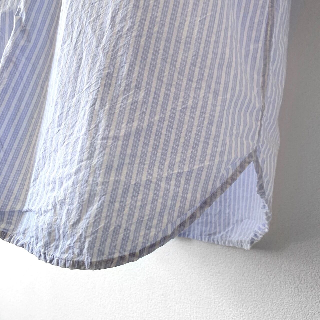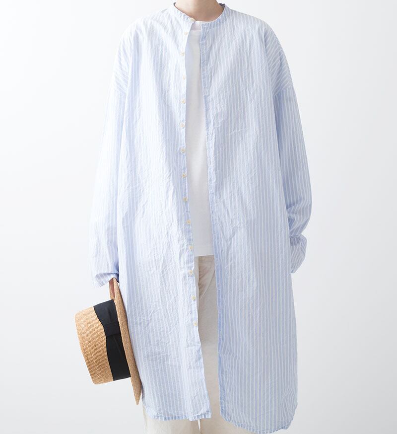 オリジナルの薄手コットン生地を使用したロングシャツです。ワッシャー加工を施した細かな皺のある生地は、さらりとした肌触りが特徴。羽織にもなるシンプルな1着です。