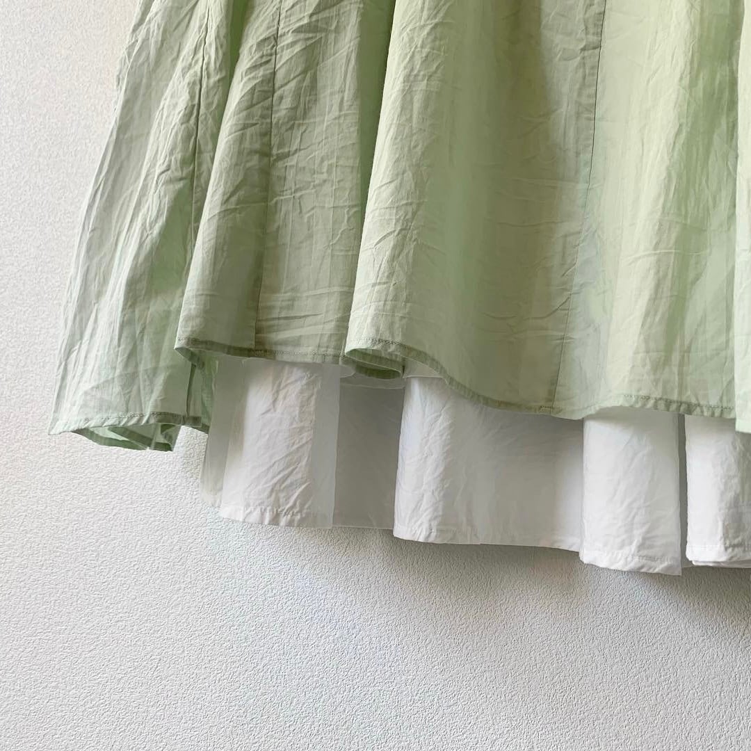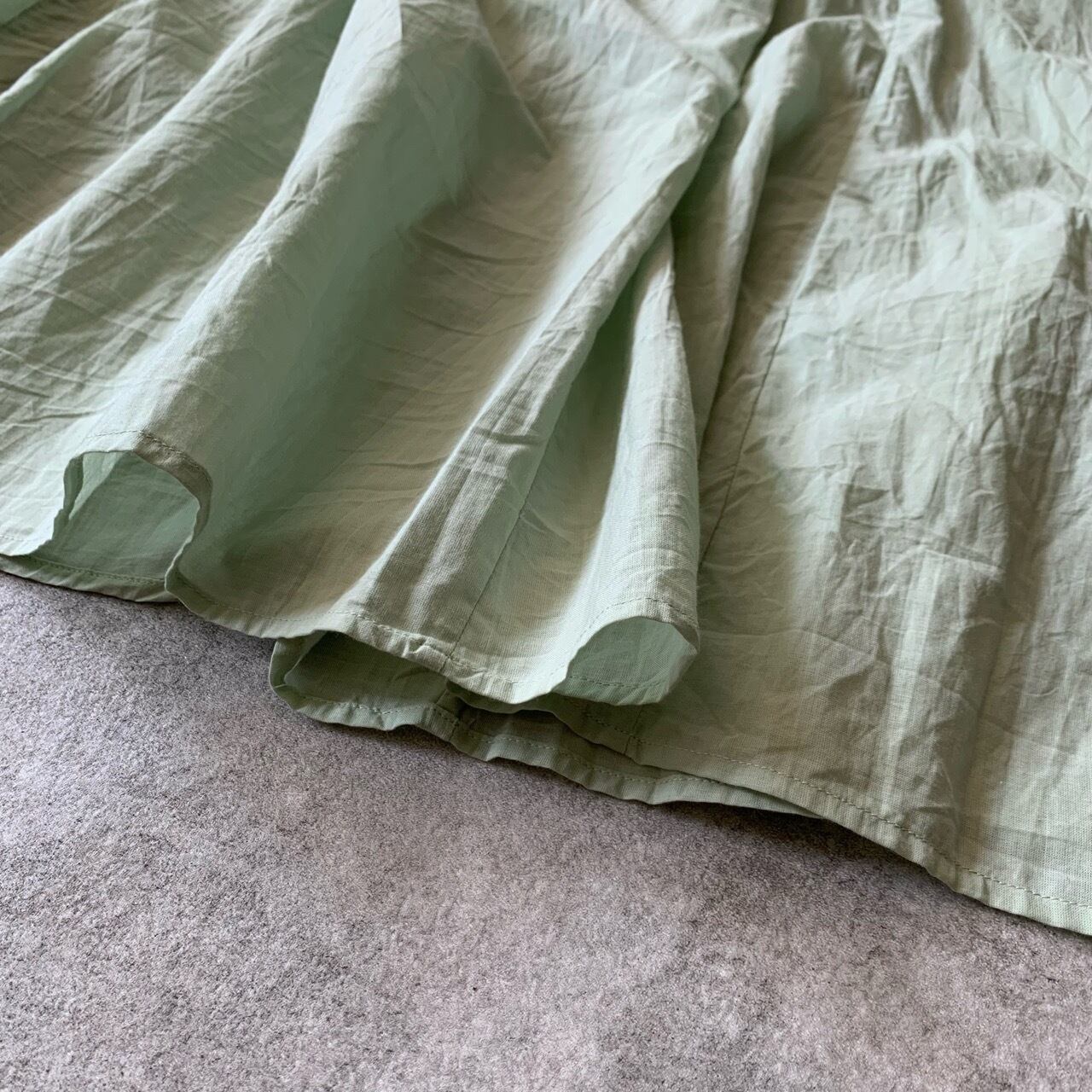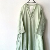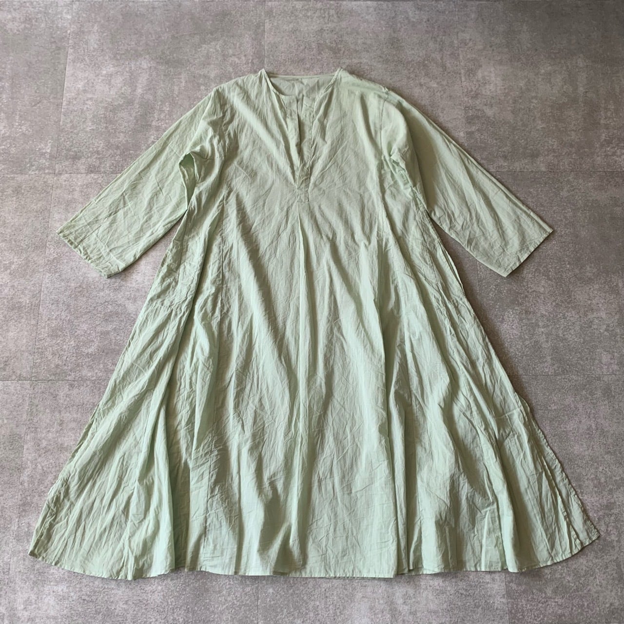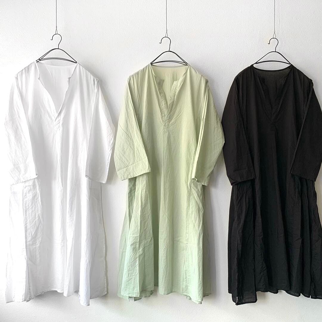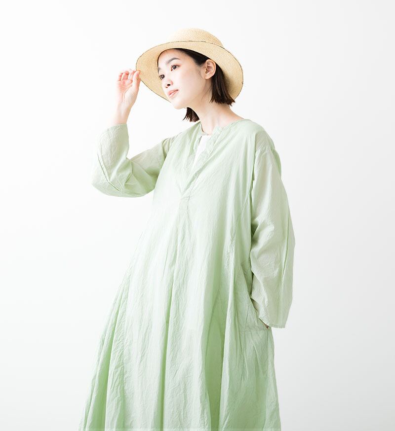脇に三角形の接ぎを何枚も並べることでフレアシルエットに仕立てたワンピースです。さらりとした薄手のカディコットンを使用しています。