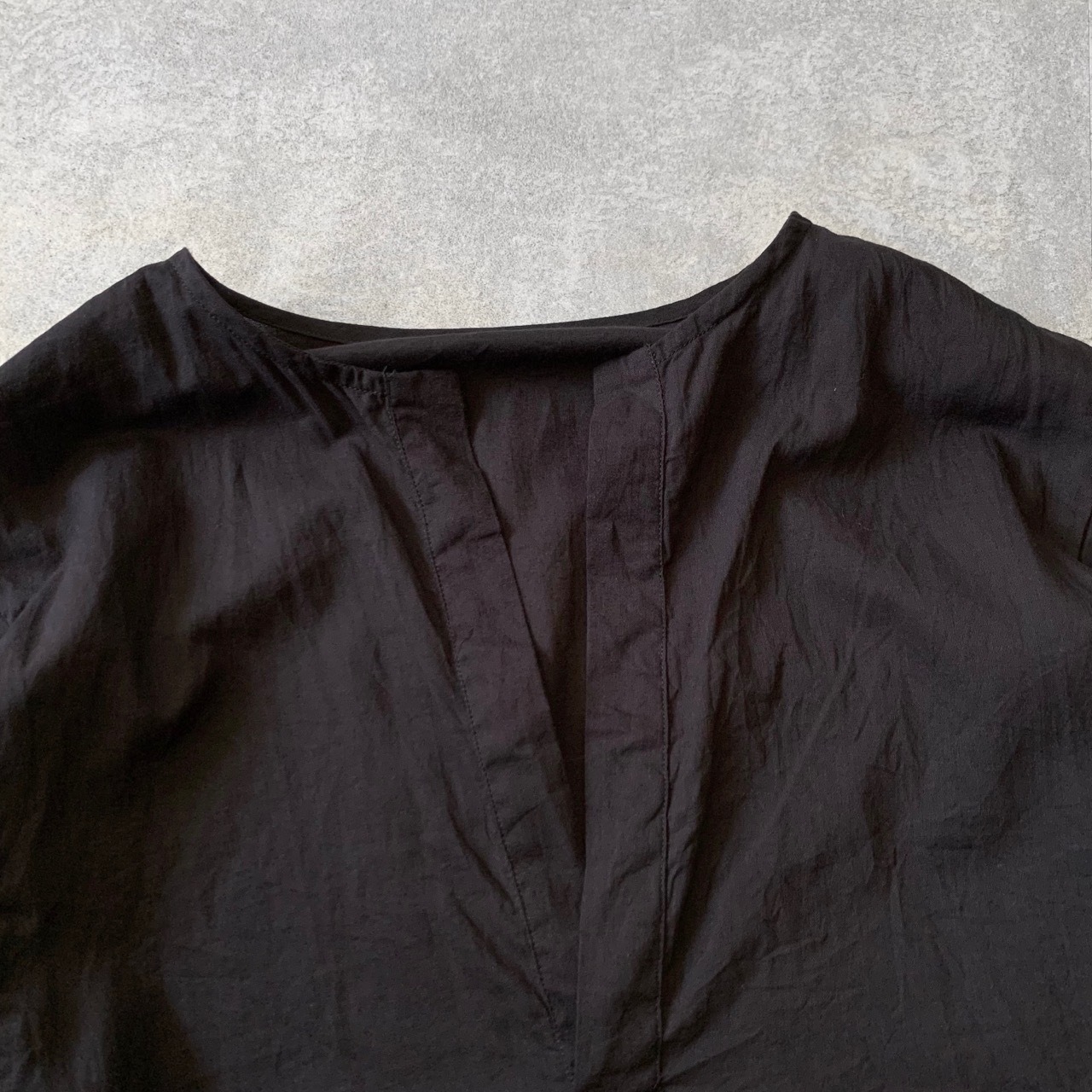 脇に三角形の接ぎを何枚も並べることでフレアシルエットに仕立てたワンピースです。さらりとした薄手のカディコットンを使用しています。