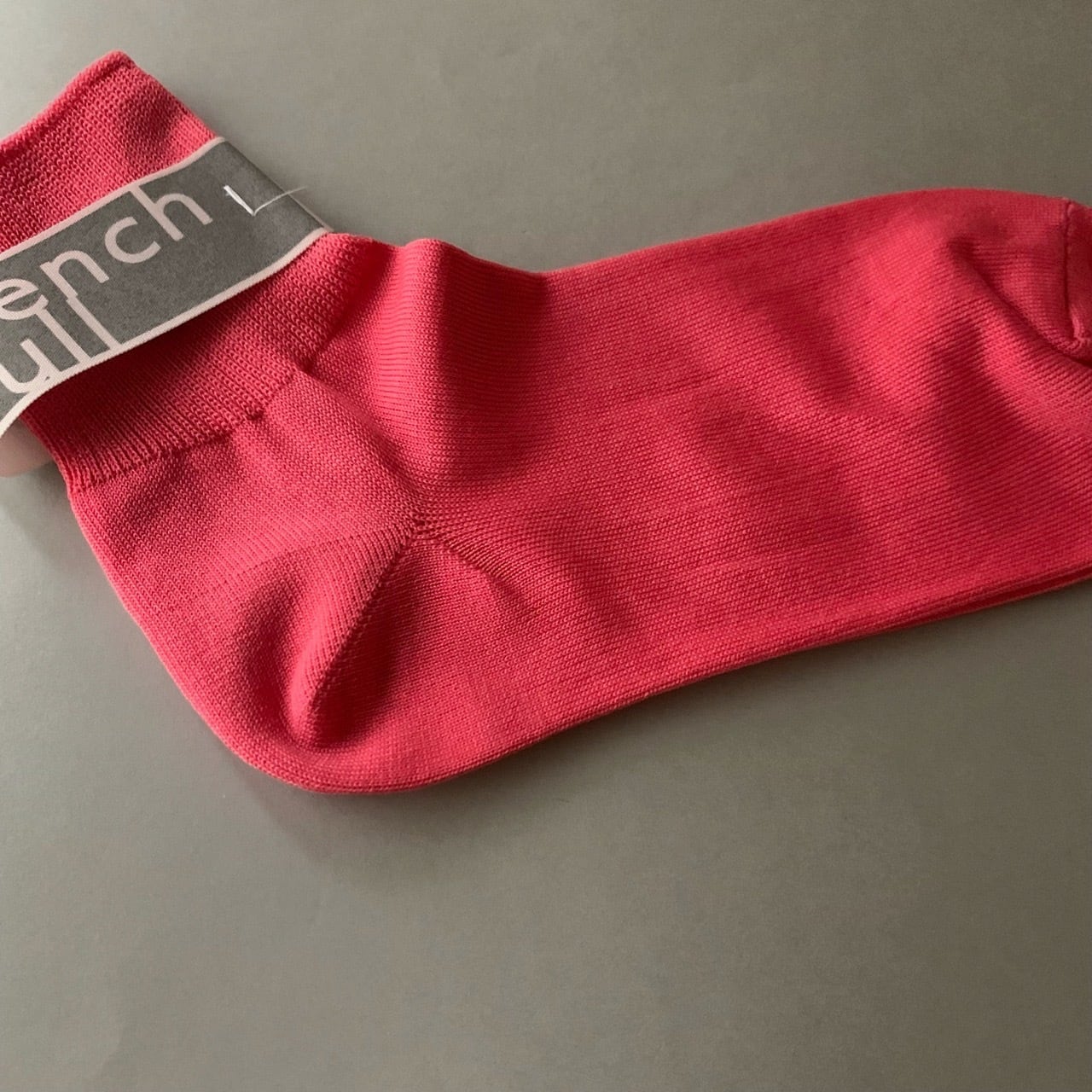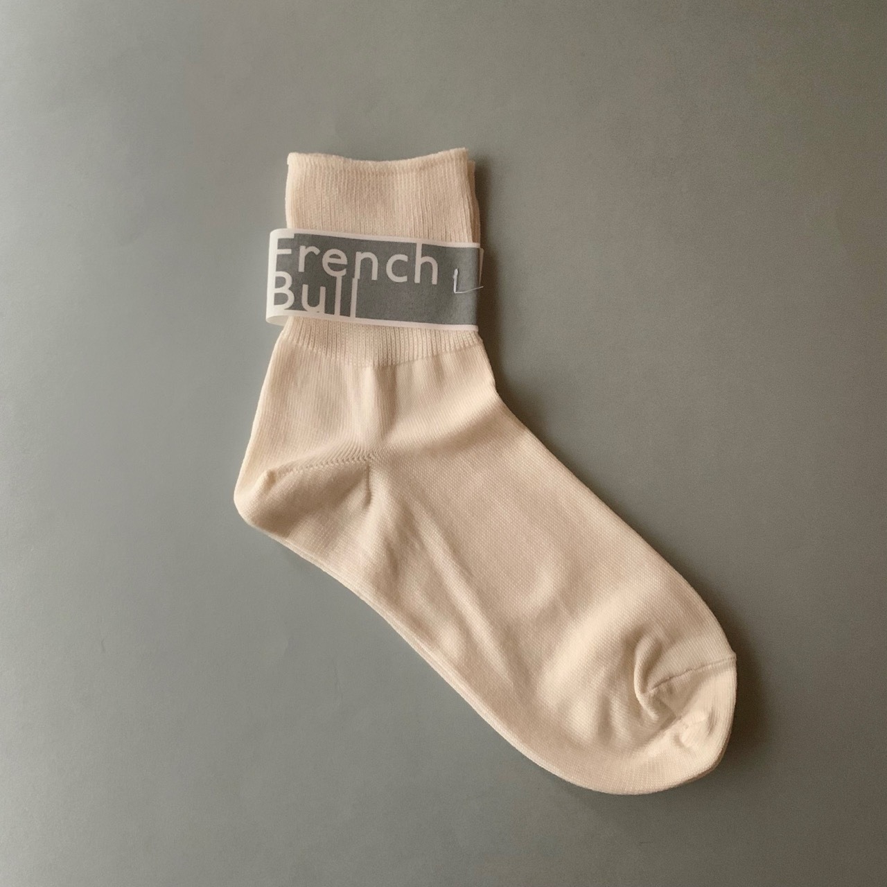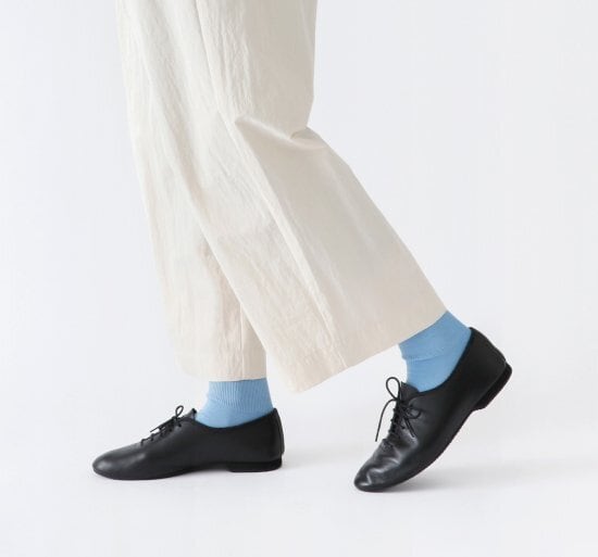 細リブ編みから天竺編みへ切り替えたシンプルなソックスです。シルケット加工を施した、さらりとした綿糸で薄く編み立てました。ゆるりとした程よいフィット感で、くるぶしが隠れる位のショート丈なので足元がスッキリとまとまります。差し色使いにもおすすめの1足です。