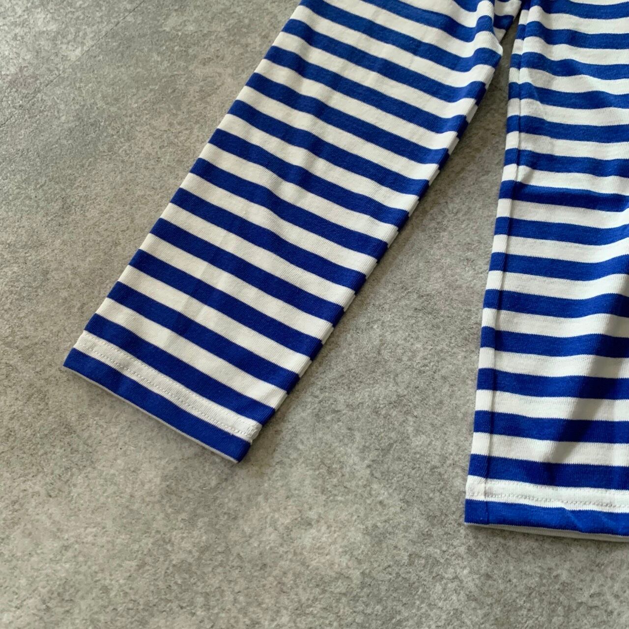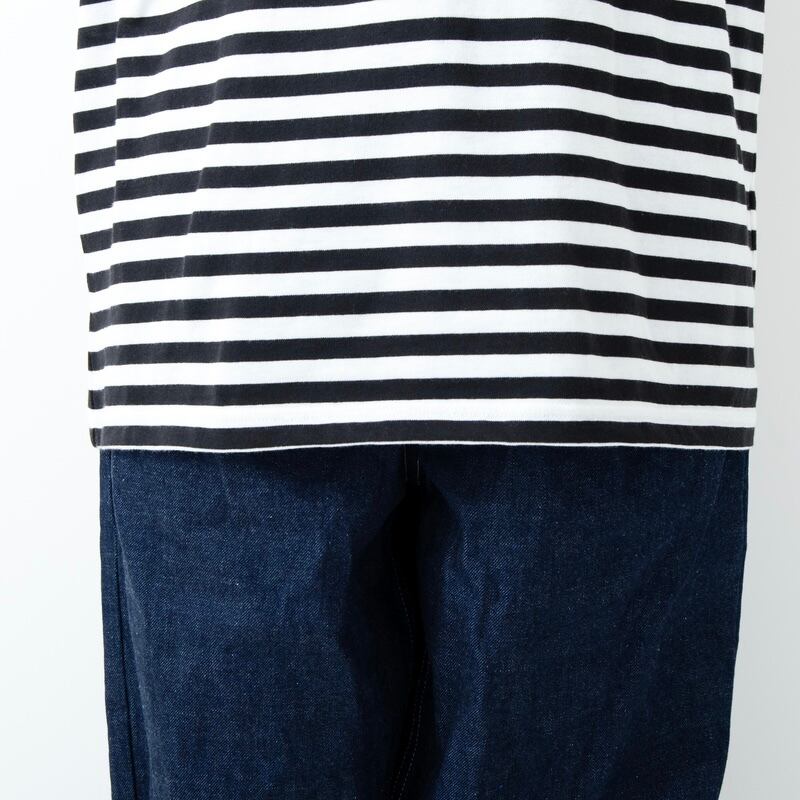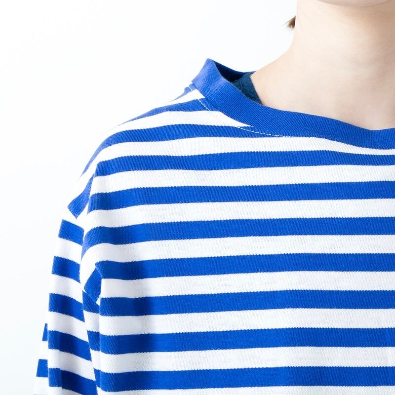 ポリエステルとコットンの混紡糸(混ぜて作られた糸)で編まれたボーダー生地を使用したカットソーです。通気性と速乾性に優れ、シワになりにくいポリエステルと、肌触りと質感が魅力の綿の特徴を併せ持つ、機能性にも優れた素材です。