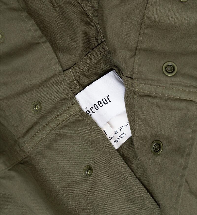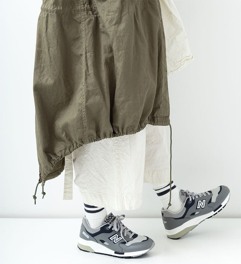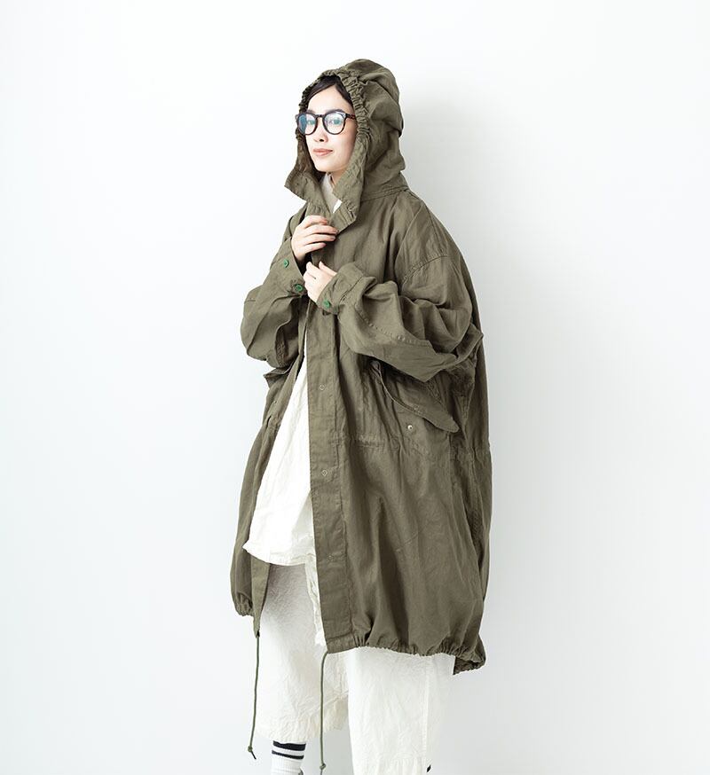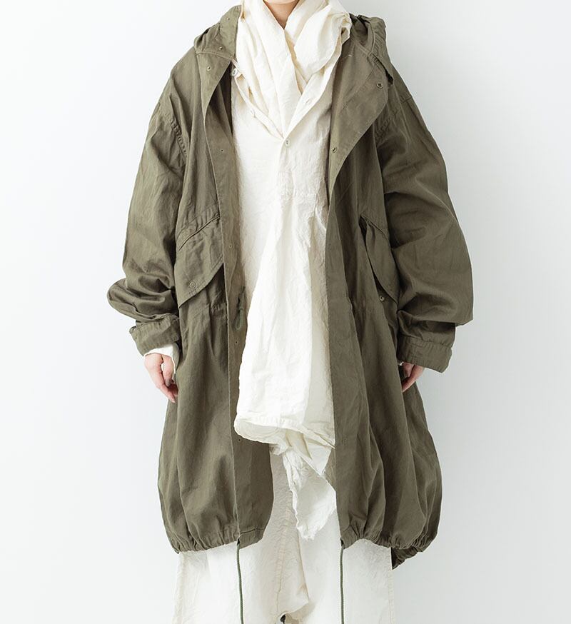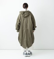 薄手のコットンサテン生地を使用したフィッシュテールパーカです。インナーを選ばないオーバーサイズシルエットです。ウエストと裾に付いたドローコードを絞ることで、シルエットの変化をたのしめます。製品染めの後に硬仕上げの工程をプラスすることで、テクスチャーにハリを出し、無骨な印象に仕上げた1着です。