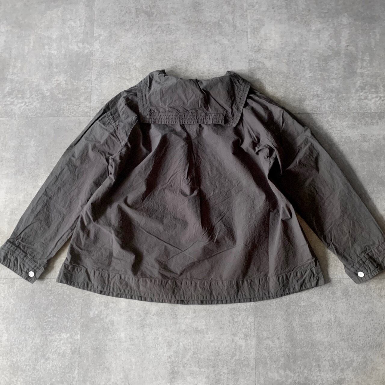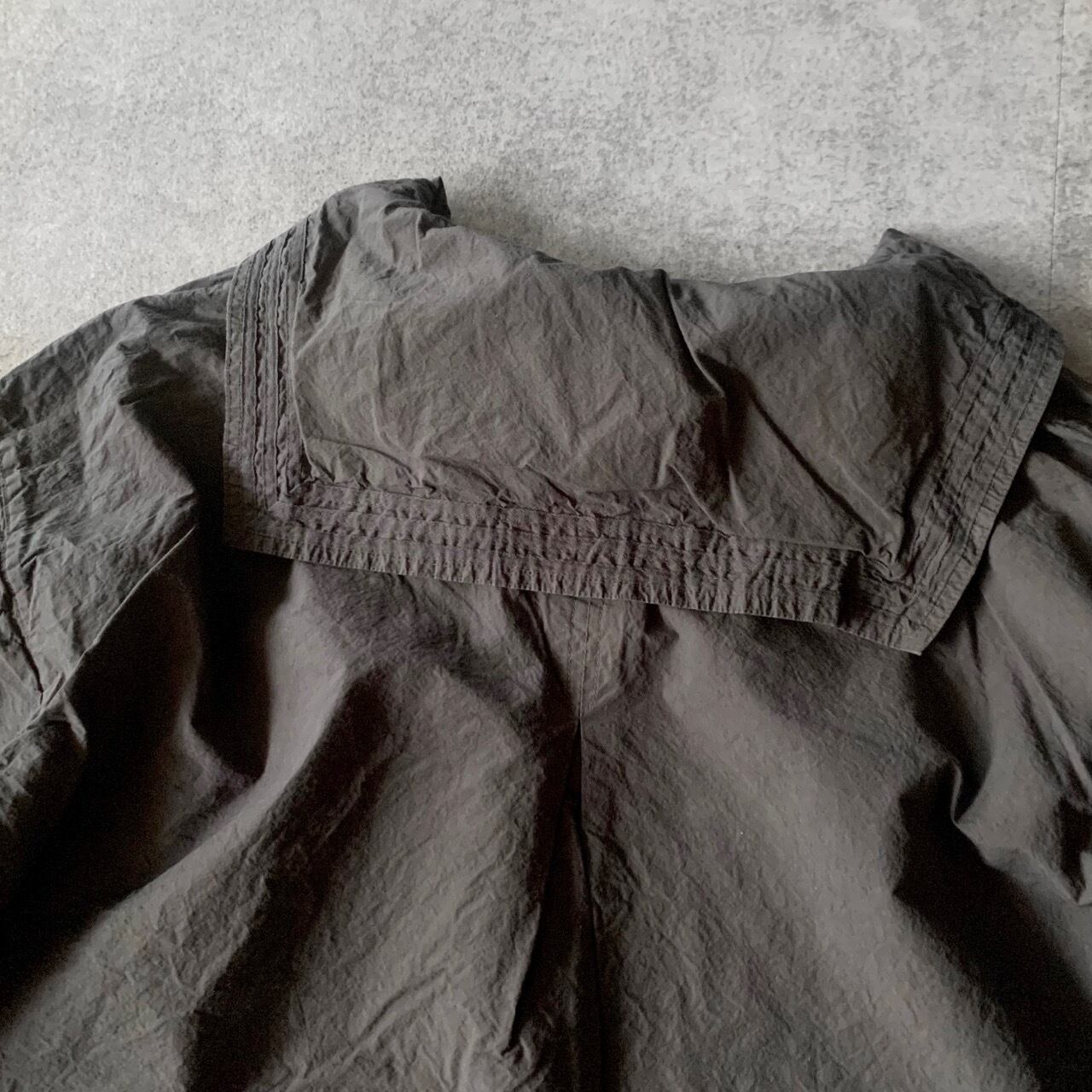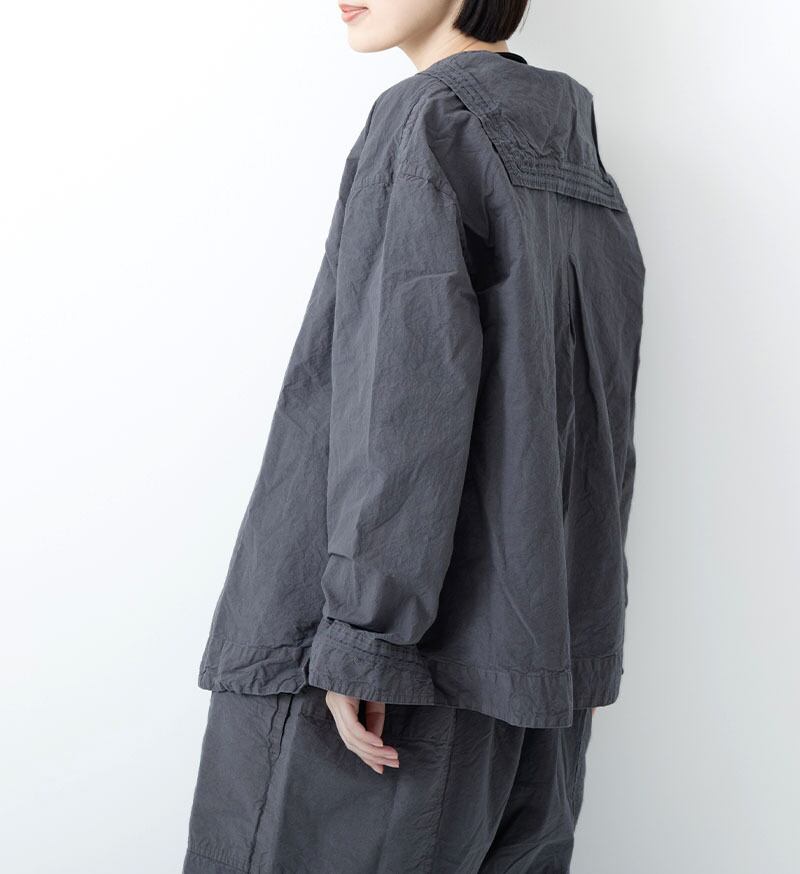 ハリのあるコットンリネンタイプライター生地を使用したセーラーカラーシャツです。製品染めの際に生地を大胆にシュリンクさせ(縮ませ)て生まれる細かなしぼや、パッカリングしたシームが表情に奥行きを与えています。程よくゆとりを持たせたボックスシルエットです。裾のサイドスリットもポイントです。