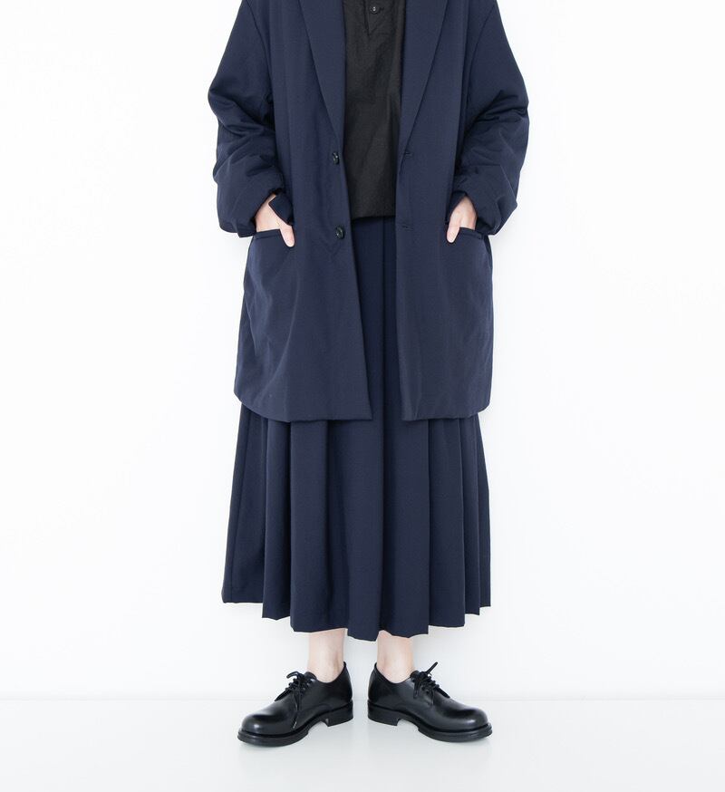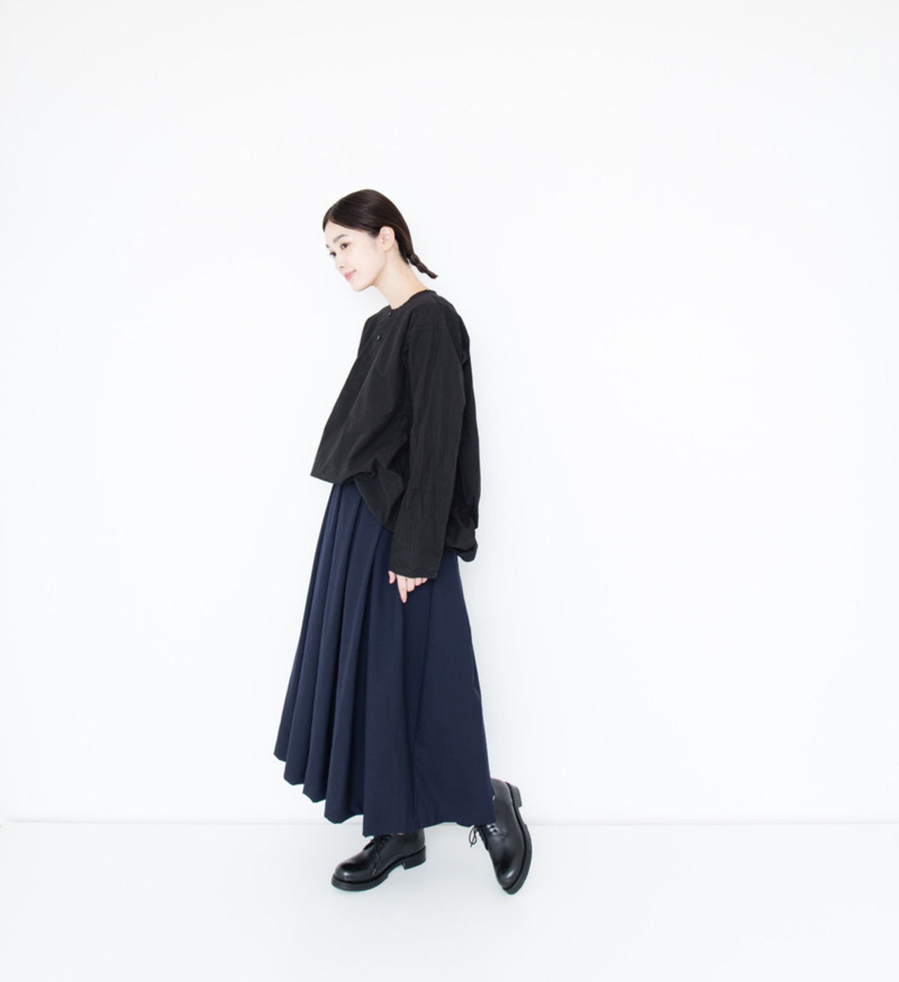 ウール素材のプリーツスカートです。平織りのウール生地にタンブラー加工による縮絨を加え、細かなしぼのあるドライなタッチに仕上げています。サイドウエストから出るヒモを絞ることで後ろにギャザーを寄せ、サイズ調節が可能です。