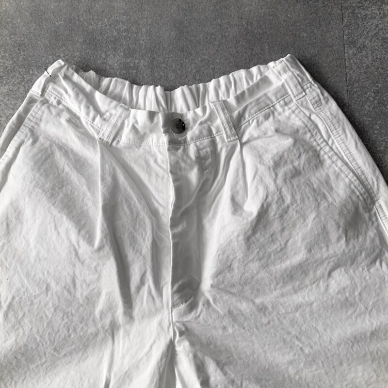 中肉厚のコットンリネンギャバジン生地を使用したパンツ。生地のたて方向にはシルクのような厚手でタフな雲斎生地を使用したパンツです。ハリのあるドライな質感の生地表面に、製品染めによるしわやパッカリングなどの表情を加え、カジュアルでラフな雰囲気に仕上げています。後ウエストのみにゴムをいれ、サイズにゆとりを持たせました。(ユニセックス)